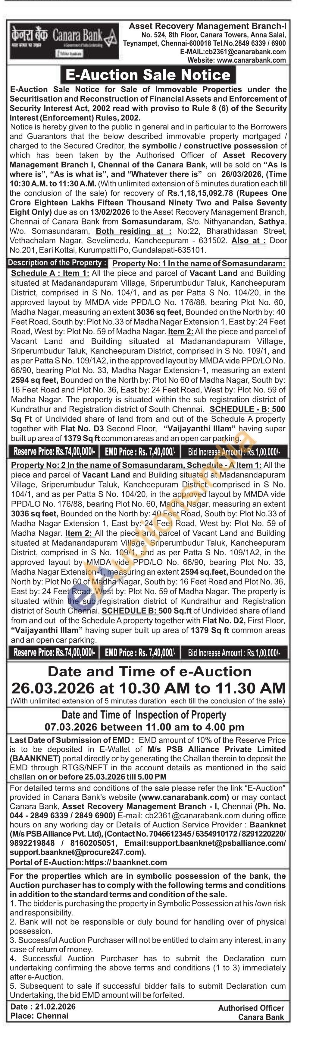 piece and parcel of Vacant Land and Building situated at Madanandapuram Village, Sriperumbudur Taluk, Kancheepuram District, comprised in S No. 104/1, and as per Patta S No. 104/20, in the approved layout by MMDA vide PPD/LO No. 176/88, bearing Plot No. 60, Madha Nagar, measuring an extent 3036 sq feet, Bounded on the North by: 40 Feet Road, South by: Plot No.33 of Madha Nagar Extension 1, East by: 24 Feet Road, West by: Plot No. 59 of Madha Nagar. Item 2: All the piece and parcel of Vacant Land and Building situated at Madanandapuram Village, Sriperumbudur Taluk, Kancheepuram District, comprised in S No. 109/1, and as per Patta S No. 109/1A2, in the approved layout by MMDA vide PPD/LO No. 66/90, bearing Plot No. 33, Madha Nagar Extension-1, measuring an extent 2594 sq.feet, Bounded on the North by: Plot No 60 of Madha Nagar, South by: 16 Feet Road and Plot No. 36, East by: 24 Feet Road, West by: Plot No. 59 of Madha Nagar. The property is situated within the sub registration district of Kundrathur and Registration district of South Chennai. SCHEDULE B: 500 Sq.ft of Undivided share of land from and out of the Schedule A property together with Flat No. D2, First Floor, "Vaijayanthi Illam" having super built up area of 1379 Sq ft common areas and an open car parking.