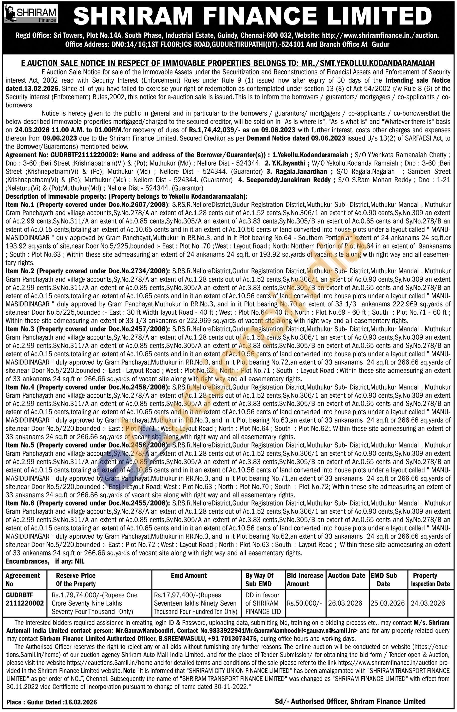 Item No.1 (Property covered under Doc.No.2607/2008): S.P.S.R. Nellore District, Gudur Registration District, Muthukur Sub-District, Muthukur Mandal, Muthukur Gram Panchayath and village accounts.Sy.No.278/A an extent of Ac. 1.28 cents out of Ac.1.52 cents. Sy.No.306/1 an extent of Ac.0.90 cents, Sy.No.309 an extent. of Ac.2.99 cents Sy.No.311/A an extent of Ac.0.85 cents. Sy.No.305/A an extent of Ac.3.83 cents, Sy. No.305/B an extent of Ac.0.65 cents and. Sy.No.278/B an extent of Ac.0.15 cents, totaling an extent of Ac.10.65 cents and in it an extent of Ac.10.56 cents of land converted into house plots under a layout called "MANU-MASIDDINAGAR duly approved by Gram Panchayat, Muthukur in PR.No.3, and in it Plot bearing No.64 Southern Portion, an extent of 24 ankanams 24 sq.ft.or 193.92 sq.yards of site, near Door No.5/225, bounded: East: Plot No.70; West: Layout Road: North: Northern Portion of Plot No.64 in an extent of 9ankanams. South: Plot No.63: Within these site admeasuring an extent of 24 ankanams 24 sq.ft. or 193.92 sq yards of vacant site along with right way and all easemen-tary rights. Item No.2 (Property covered under Doc. No.2734/2008): S.PS.R.Nellore District, Gudur Registration District Muthukur Sub-District, Muthukur Mandal, Muthukur Gram Panchayath and village accounts. Sy.No.278/A an extent of Ac.1.28 cents out of Ac. 1.52 cents, Sy.No.306/1 an extent of Ac.0.90 cents, Sy.No.309 an extent of Ac.2.99 cents, Sy.No.311/A an extent of Ac.0.85 cents. Sy.No.305/A an extent of Ac.3.83 cents, Sy.No.305/B an extent of Ac.0.65 cents and Sy.No.278/B an extent of Ac.0.15 cents, totaling an extent of Ac. 10.65 cents and in it an extent of Ac.10.56 cents of land converted into house plots under a layout called" MANU-MASIDDINAGAR" duly approved by Gram Panchayat, Muthukur in PR.No.3, and in it Plot bearing No.70, an extent of 33 1/3 ankanams 222.969 sq.yards of site, near Door No.5/225, bounded: East: 30 ft Width layout Read-40 ft; West: Plot No.64-40 ft North Plot No.69-60 ft South Plot No.71-60 ft: Within these site admeasuring an extent of 33 1/3 ankanams or 222.969 sq.yards of vacant site along with right way and all easementary rights. Item No.3 (Property covered under Doc. No.2457/2008): S.PS.R. Nellore District, Gudur Registration District, Muthukur Sub-District, Muthukur Mandal, Muthukur Gram Panchayath and village accounts, Sy.No.278/A an extent of Ac.1.28 cents out of Ac.1.52 cents, Sy.No.306/1 an extent of Ac.0.90 cents, Sy.No.309 an extent of Ac.2.99 cents Sy.No.311/A an extent of Ac.0.85 cents, Sy.No.305/A an extent of Ac.3.83 cents, Sy. No.305/B an extent of Ac.0.65 cents and Sy.No.278/B an extent of Ac.0.15 cents, totaling an extent of Ac.10.65 cents and in it an extent of Ac. 10.56 cents of land converted into house plots under a layout called" MANU- MASIDDINAGAR" duly approved by Gram Panchayat, Muthukur in PR.No.3, and in it Plot bearing No.72, an extent of 33 ankanams 24 sq.ft or 266.66 sq.yards of site, near Door No.5/220, bounded East: Layout Road: West: Plot No.62; North: Plot No.71; South Layout Road: Within these site admeasuring an extent. of 33 ankanams 24 sq.ft or 266.66 sq.yards of vacant site along with right way and all easementary rights.