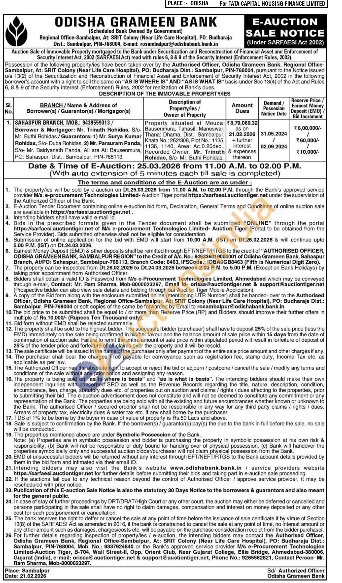 Property situated at Mouza: Bausenmura, Tahasil: Maneswar, Thana: Dhama, Dist. Sambalpur, Khata No.: 262/308, Plot No.: 1135, 1136, 1140, Area: Ac.0.20dec., Recorded Owner: Mr. Trinath Rohidas, S/o- Mr. Buthi Rohidas.