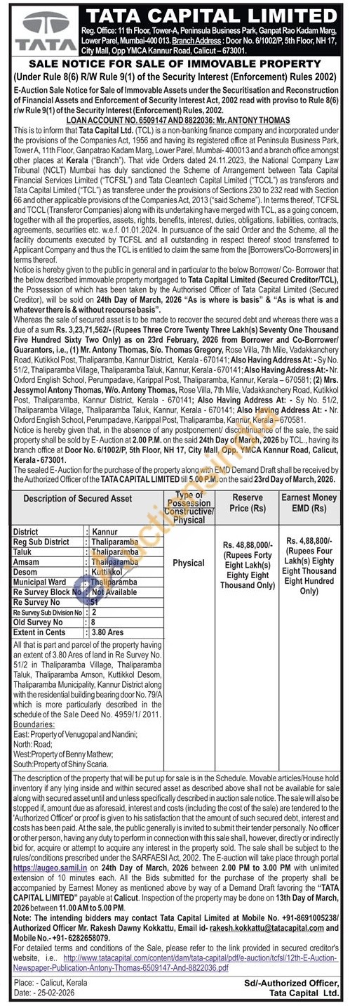 All that is part and parcel of the property having an extent of 3.80 Ares of land in Re Survey No. 51/2 in Thaliparamba Village, Thaliparamba Taluk, Thaliparamba Amson, Kuttikkol Desom, Thaliparamba Municipality, Kannur District along with the residential building bearing door No. 79/A which is more particularly described in the schedule of the Sale Deed No. 4959/1/2011. Boundaries: East: Property of Venugopal and Nandini; North: Road; West:Property of Benny Mathew; South: Property of Shiny Scaria.