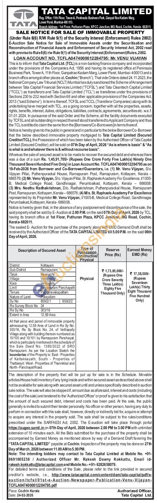 All that piece and parcel of immovable property admeasuring 12.59 Ares of Land in Re Sy No. 303/16, Re Sy Block No. 24, of Vellilapally Village along with building thereon numbered as 10/100 and 10/101 by Ramapuram Panchayat, which is particularly mentioned in the schedule of the Sale Deed No. 1385/2022 of SRO Ramapuram. As per the Location Sketch the boundaries of the Property is: East-Properties of Kattakkayath; South Properties of Thattarayil; West-Properties of Thannikkal and North-Panchayat Road.