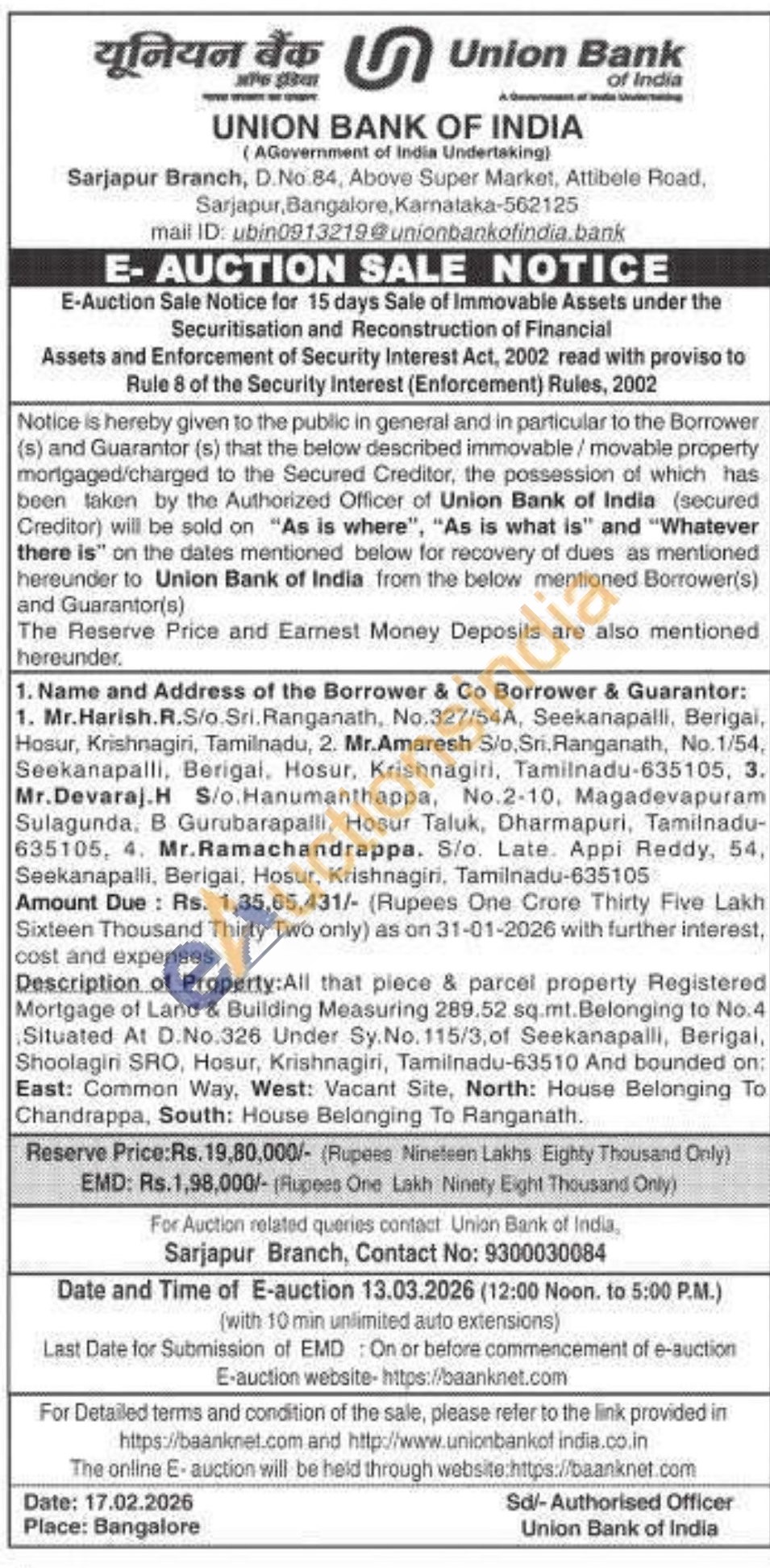 Description of Property: All that piece & parcel property Registered Mortgage of Land & Building Measuring 289.52 sq.mt.Belonging to No.4 Situated At D.No.326 Under Sy. No. 115/3, of Seekanapalli, Berigai, Shoolagini SRO, Hosur, Krishnagiri, Tamilnadu-63510 And bounded on: East: Common Way, West: Vacant Site, North: House Belonging To Chandrappa, South: House Belonging To Ranganath.