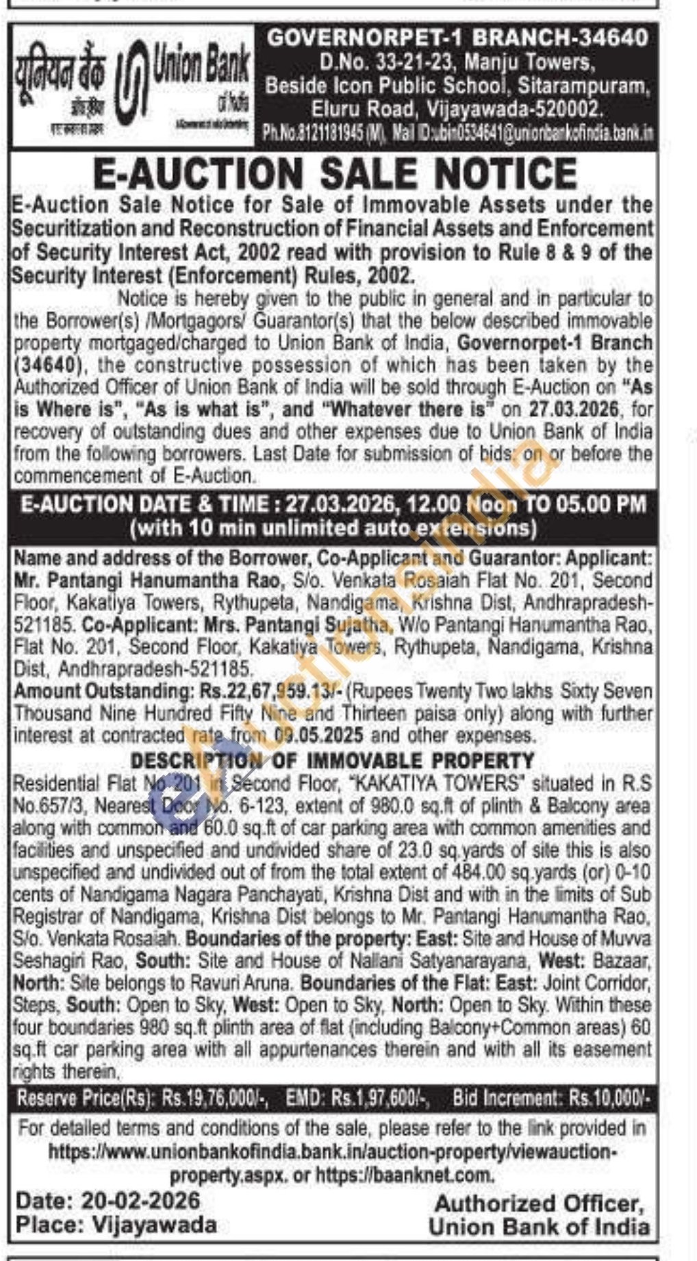 Residential Flat No 201 in Second Floor, "KAKATIYA TOWERS" situated in R.S No.657/3, Nearest Door No. 6-123, extent of 980.0 sq.ft of plinth & Balcony area along with common and 60.0 sq.ft of car parking area with common amenities and facilities and unspecified and undivided share of 23.0 sq yards of site this is also unspecified and undivided out of from the total extent of 484.00 sq.yards (or) 0-10 cents of Nandigama Nagara Panchayati, Krishna Dist and with in the limits of Sub Registrar of Nandigama, Krishna Dist belongs to Mr. Pantangi Hanumantha Rao, Slo. Venkata Rosaiah. Boundaries of the property: East: Site and House of Muvva Seshagiri Rao, South: Site and House of Nallani Satyanarayana, West: Bazaar, North: Site belongs to Ravuri Aruna. Boundaries of the Flat: East: Joint Corridor, Steps, South: Open to Sky, West: Open to Sky, North: Open to Sky. Within these four boundaries 980 sq.ft plinth area of flat (including Balcony+Common areas) 60 sq.ft car parking area with all appurtenances therein and with all its easement rights therein,