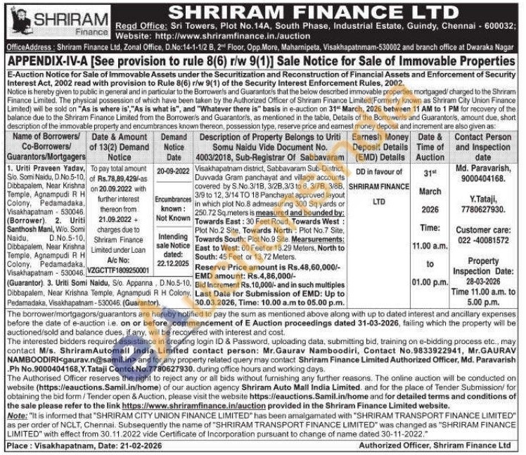 Visakhapatnam district, Sabbavaram Sub-District, Duvvada Gram panchayat and village accounts covered by S.No. 3/18, 3/28 3/3 to 6, 3/7B, 3/8B, 3/9 to 12, 3/14 TO 18 Panchayat approved layout in which plot No.8 admeasuring 300 Sq yards or 250.72 Sq.meters is measured and bounded by: Towards East: 30 Feet Road, Towards West: Plot No.2 Site, Towards North: Plot No.7 Site,Towards South: Plot No.9 Site. Mearsurements: East to West: 60 Feet or 18.29 Meters, North to South: 45 Feet or 13.72 Meters
