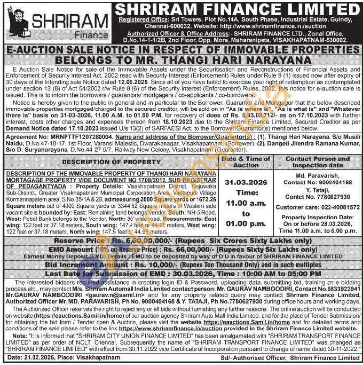 DESCRIPTION OF THE IMMOVABLE PROPERTY OF THANGI HARI NARAYANA MORTAGAGE PROPERTY VIDE DOCUMENT NO 1708/2012, SUB-REGISTRAR OF PEDAGANTYADA Property Details: Visakhapatnam District, Gajuwaka Sub-District, Greater Visakhapatnam Municipal Corporation Area, Vadlapudi Village Kurmannapalem area, S.No. 35/1A82B, admeasuring 2000 Square yards or 1672.26 Square meters out of 4000 Square yards or 3344.52 Square meters of Western side vacant site is bounded by: East: Remaining land belongs Vendor, South: NH-5 Road, West: Petrol Bunk belongs to the Vendor, North: 30 wide road. Measurements: East wing: 122 feet or 37.18 meters, South wing: 147.4 feet or 44.95 meters, West wing: 122 feet or 37.18 meters, North wing: 147.5 feet or 44.95 meters
