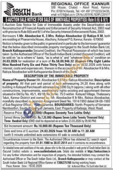 DESCRIPTION OF THE IMMOVABLE PROPERTY : Name of Property Owner: Mr. Aboobacker K& Mrs. Rabiya Aboobacker, Description of property: All that part and parcel of land admeasuring 24.20 Ares along with building in Kolayad Panchayath admeasuring 3200 Sq.ft (approx.) along with all other constructions, improvements, easementary rights existing and appurtenant thereon situated in Old Sy No. 45/1, 49/1B, Re Sy No. 75/3 within Kolayad Village, Thalassery Taluk, Kannur District and owned by Mr. Aboobacker K & Mrs. Rabiya Aboobacker, morefully described in Jenmam Assignment Deed No. 1914/1993 dated 04-06-1993 of Sub Registrar Office Kuthuparamba. BOUNDARIES: North: Property of Vamanan Namboothini, South: Property of Jameela, East: Property of Kadeeja, West: Road