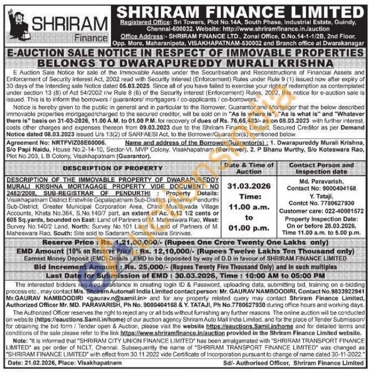 MURALI KRISHNA MORTAGAGE PROPERTY VIDE DOCUMENT NO 2482/2008, SUB-REGISTRAR OF PENDURTHI: Property Details: Visakhapatnam District Erstwhile Gopalapatnam Sub-District, presently Pendurthi Sub-District, Greater Municipal Corporation Area, China Musidiwada Village Accounts, Khata No.364, S.No. 140/7 part, an extent of Ac. 0.12 1/2 cents or 605 Sq.yards, bounded on East: Land of Partners of M. Maheswara Rao, West: Survey No. 140/2 Land, North: Survey No. 101 Land & Land of Partners of M. Maheswara Rao, South: Site sold to Sadaram Somasekhara Srinivas