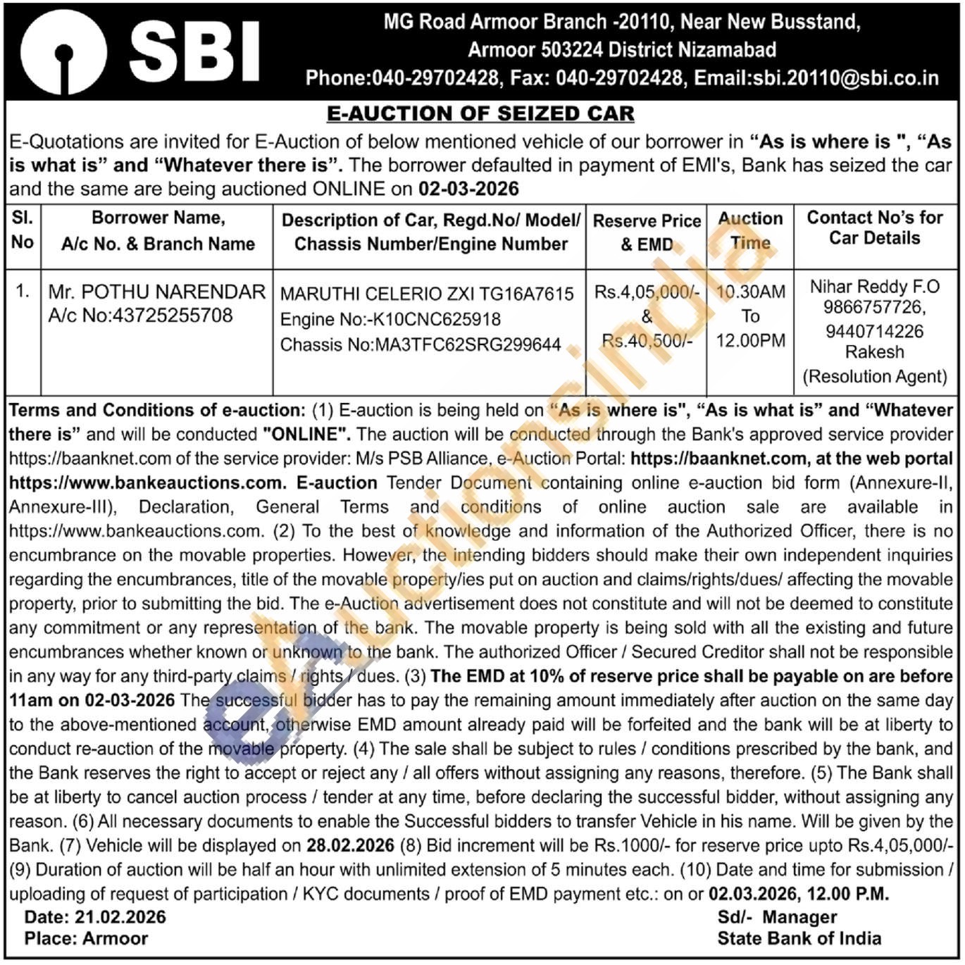 Description of Car, Regd.No/ Model/Chassis Number/Engine Number : MARUTHI CELERIO ZXI TG16A7615 Engine No:-K10CNC625918 Chassis No: MA3TFC62SRG299644