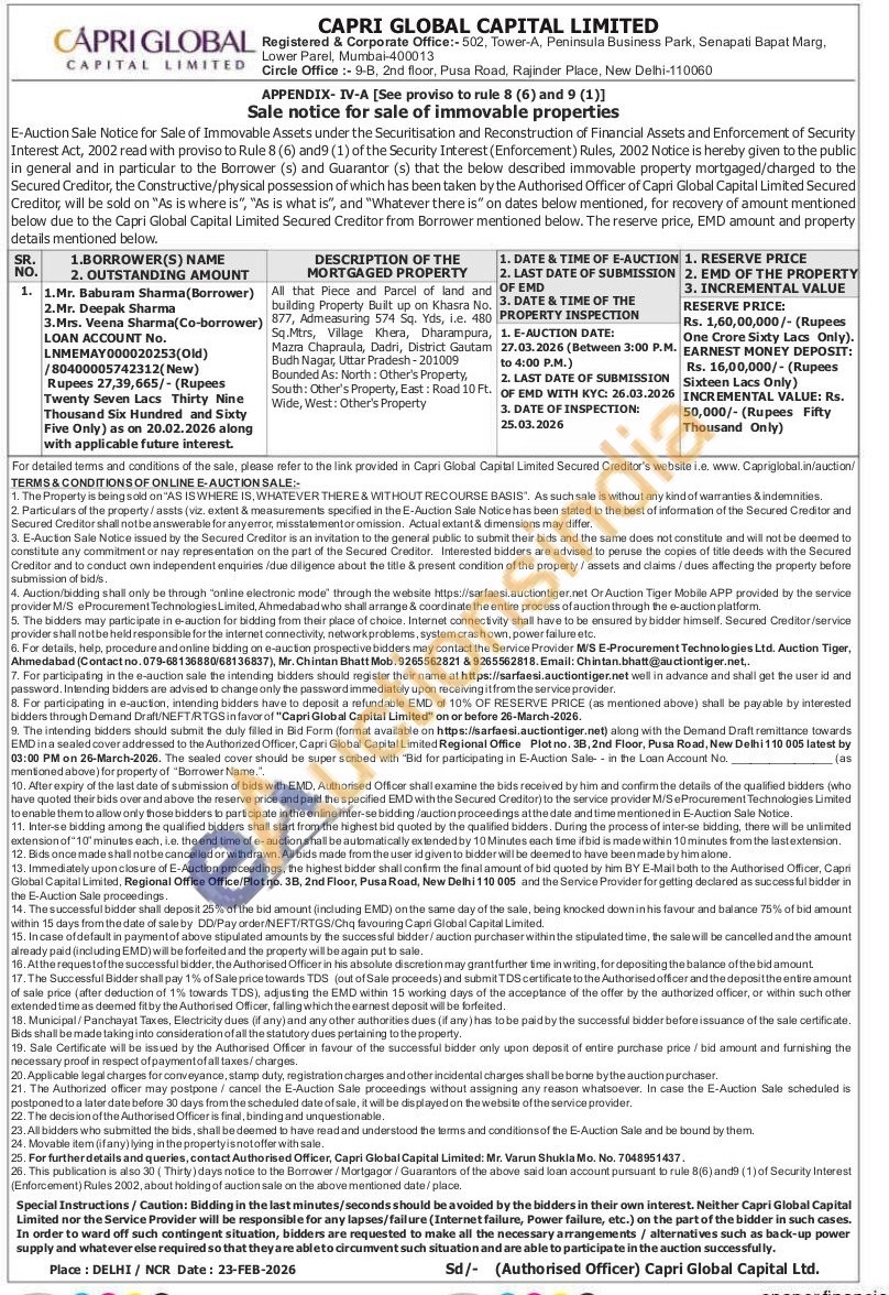 All that Piece and Parcel of land and building Property Built up on Khasra No. 877, Admeasuring 574 Sq. Yds, Le. 480 Sq.Mtrs, Village Khera, Dharampura, Mazra Chapraula, Dadri, District Gautam Budh Nagar, Uttar Pradesh-201009 Bounded As: North: Other's Property, South: Other's Property, East: Road 10 Ft. Wide, West: Other's Property