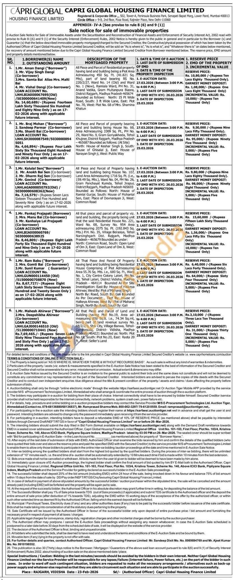 All that piece and parcel of property viz. land and building, the property being unit that the said Residential House No. 221, Ward No. 08, Survey No. 954 Area admeasuring 2075 Sq. Ft. (192.843 Sq. Mts.) P.H. No. 35, Village Berasiya, Tehsil Narsinghgarh Dist. Rajgarh, Madhya Pradesh-465679 Bounded as under: North: Common Road, South: Open Land of Om Ji, East: Open Land of Om Ji, West: Common Road