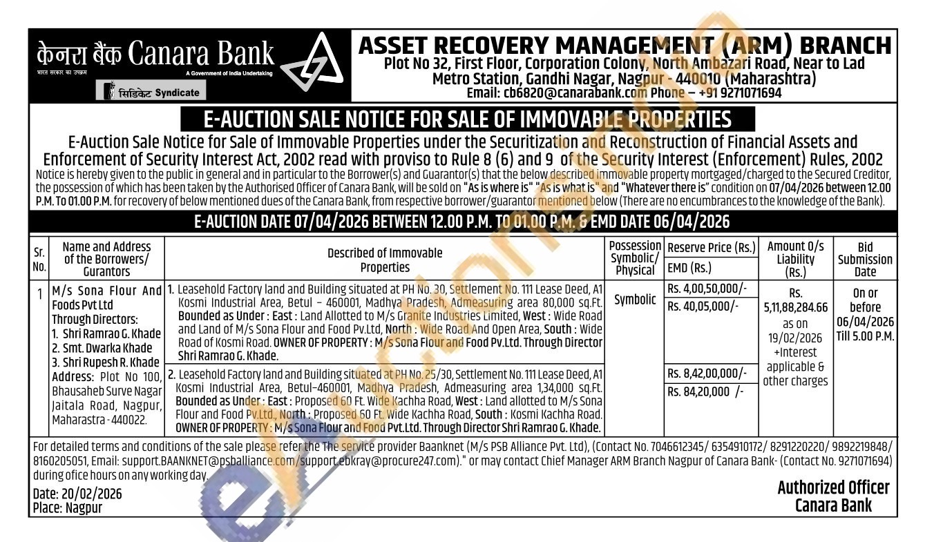 Leasehold Factory land and Building situated at PH No. 25/30, Settlement No. 111 Lease Deed, A1 Kosmi Industrial Area, Betul-460001, Madhya Pradesh, Admeasuring area 1,34,000 sq.Ft. Bounded as Under: East: Proposed 60 Ft. Wide Kachha Road, West: Land allotted to M/s Sona Flour and Food Pv.Ltd., North: Proposed 60 Ft. Wide Kachha Road, South: Kosmi Kachha Road. OWNER OF PROPERTY: M/s Sona Flour and Food Pvt.Ltd. Through Director Shri Ramrao G. Khade.
