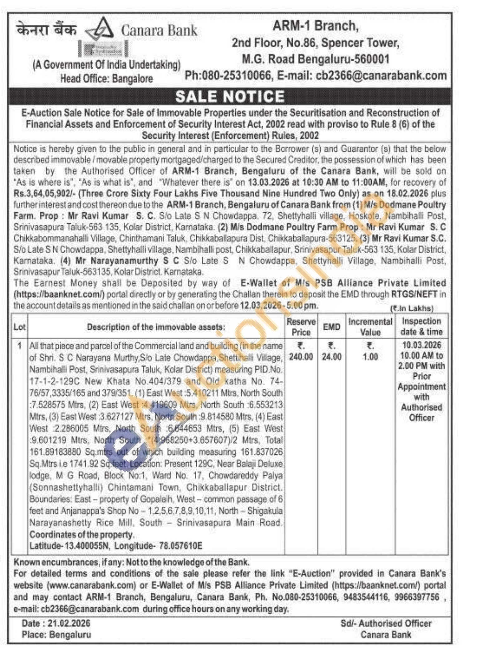 All that piece and parcel of the Commercial land and building (in the name of Shri. S C Narayana Murthy, Slo Late Chowdappa, Shettihalli Village, Nambihalli Post, Srinivasapura Taluk, Kolar District) measuring PID.No. 17-1-2-129C New Khata No.404/379 and Old katha No. 74-76/57,3335/165 and 379/351. (1) East West :5.410211 Mtrs, North South 7.528575 Mtrs, (2) East West :4.419609 Mtrs, North South :6.553213 Mtrs, (3) East West :3.627127 Mtrs, North South :9.814580 Mtrs, (4) East West 2.286005 Mirs, North South :6.644653 Mtrs, (5) East West 9.601219 Mtrs, North South (4.968250+3.657607)/2 Mtrs, Total 161.89183880 Sq.mtrs out of which building measuring 161.837026 Sq.Mtrs ie 1741.92 Sq.feet. Location: Present 129C, Near Balaji Deluxe lodge, MG Road, Block No:1, Ward No. 17, Chowdareddy Palya (Sonnashettyhalli) Chintamani Town, Chikkaballapur District. Boundaries: East-property of Gopalaih, West-common passage of 6 feet and Anjanappa's Shop No-1,2,5,6,7,8,9,10,11, North-Shigakula Narayanashetty Rice Mill, South Srinivasapura Main Road