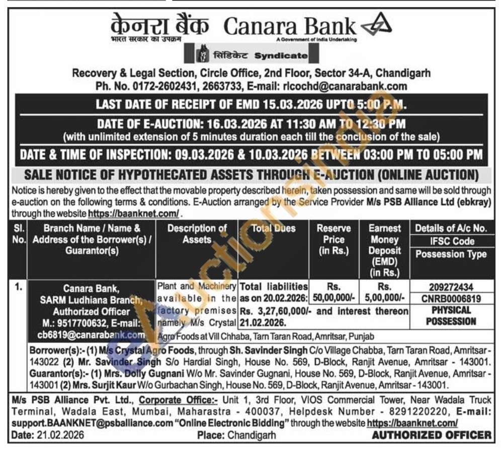 Plant and Machinery available in the factory premises namely M/s Crystal Agro Foods at Vill Chhaba, Tarn Taran Road, Amritsar, Punjab