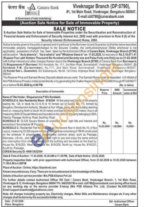 Name of Title Holder: Bhapanamma P Wio Kondaiah, SCHEDULE A: Alur Residential Block-816/204 All that piece and Paroal of the property bearing No. 128, in block No. 13,14,15 & 16 formed out of Survey No. 113, formed by Bengaluru Development Authority, Situated at Alur Village, along with the building standing there on, measuring North to South 44.00 meters and East to West 60.00 meters, thus in all measuring 2640.00 Square Meters and bounded on the: East by: Property belonging to BDA, West by: Passage, North by: Road, South by: Road SCHEDULE B: 33.526 Square Meters of undivided share, right title and interest and ownership in the schedule 'A' Property. SCHEDULE C: Residential Flat No. 816/204 on the second floor in block No. 16, of Alur Layout, measuring 33.526 square meters of Built up area comprising of 18HK constructed on the schedule 'A' property and proportionate common areas, such as Passage, Staircase, Lift etc., and have the exclusive right to use and enjoy the same without any interruption from other co-owners of the building and bounded on the East by: House No. B16/203, West by: House No. 816/205, North by. House No. 816/201 South by: Passage.