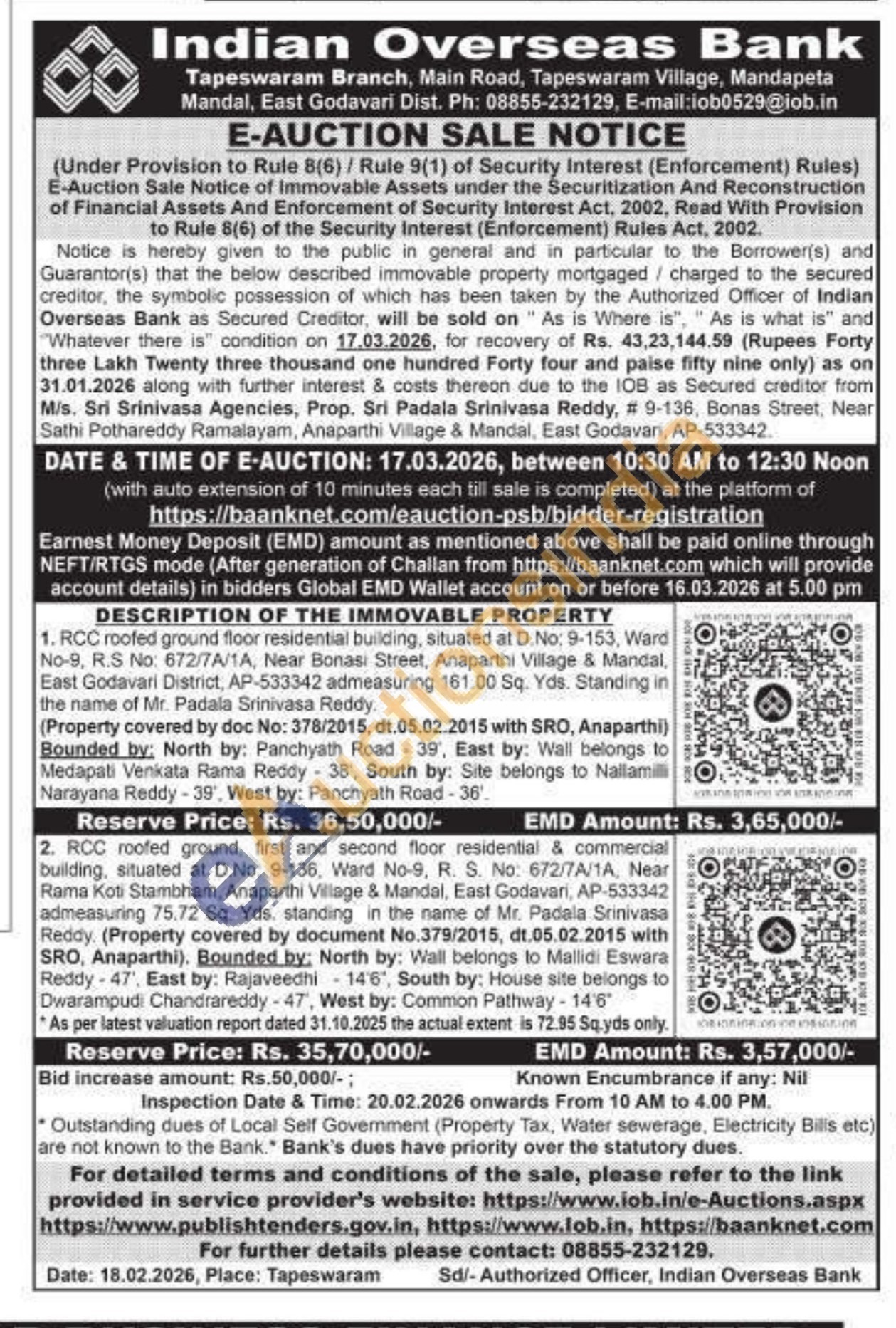RCC roofed ground floor residential building, situated at D. No: 9-153, Ward No-9, R.S No: 672/7A/1A, Near Bonasi Street, Anaparthi Village & Mandal, East Godavari District, AP-533342 admeasuring 161.00 Sq. Yds. Standing in the name of Mr. Padala Srinivasa Reddy. (Property covered by doc No: 378/2015, dt. 05.02.2015 with SRO, Anaparthi) Bounded by: North by: Panchyath Road 39, East by: Wall belongs to Medapati Venkata Rama Reddy 38, South by: Site belongs to Nallam Narayana Reddy-39, West by: Panchyath Road-36