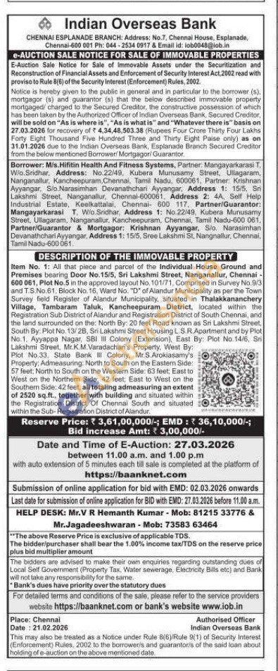 Item No. 1: All that piece and parcel of the Individual House Ground and Premises bearing Door No.15/5, Sri Lakshmi Street, Nanganallur, Chennai-600 061, Plot No.5 in the approved layout No. 101/71, Comprised in Survey No. 9/3 and T.S. No.61, Block No. 16, Ward No. "D" of Alandur Municipality as per the Town Survey field Register of Alandur Municipality, situated in Thalakkananchery Village, Tambaram Taluk, Kancheepuram District, located within the Registration Sub District of Alandur and Registration District of South Chennai, and the land surrounded on the: North By: 20 feet Road known as Sri Lakshmi Street, South By: Plot No. 13/2B, Sri Lakshmi Street Housing L.S.R.Apartment and by Plot No. 1. Ayyappa Nagar, SBI III Colony (Extension), East By: Plot No. 14/6, Sri Lakshmi Street, Mr.K.M.Varadachari's Property, West By: Plot No.33. State Bank III Colony, Mr. S.Arokiasamy's Property: Admeasuring: North to South on the Eastern Side: 57 feet, North to South on the Western Side: 63 feet, East to West on the Northern Side: 42 feet, East to West on the Southern Side: 42 feet, all totaling admeasuring an extent of 2520 sq.ft., together with building and situated within the Registration District Of Chennai South and situated within the Sub-Registration District of Alandur