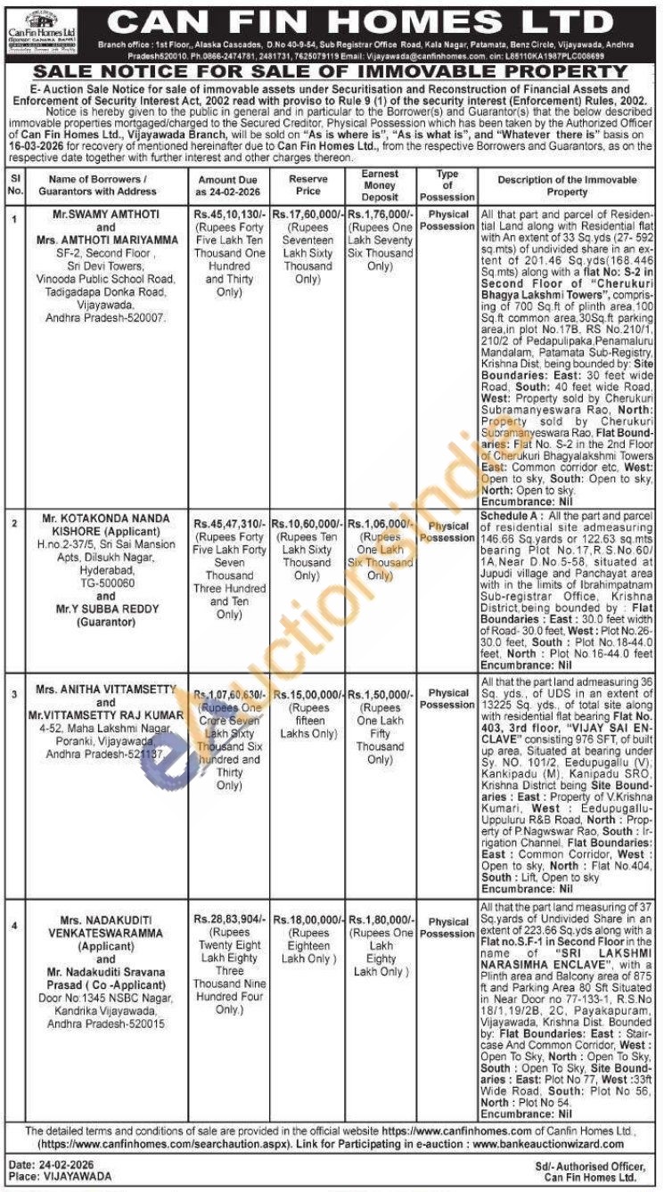 3) All that the part land admeasuring 36 Sq. yds., of UDS in an extent of 13225 Sq. yds., of total site along with residential flat bearing Flat No. 403, 3rd floor, "VIJAY SAI EN-CLAVE" consisting 976 SFT, of built up area, Situated at bearing under Sy. NO. 101/2, Eedupugallu (V): Kankipadu (M), Kanipadu SRO Krishna District being Site Bound-aries: East: Property of V.Krishna Kumari, West Eedupugallu-Uppuluru R&B Road, North Prop-erty of P.Nagwswar Rao, South: Ir-rigation Channel, Flat Boundaries: East: Common Corridor, West: Open to sky, North Flat No.404. South: Lift, Open to sky Encumbrance: Nil
