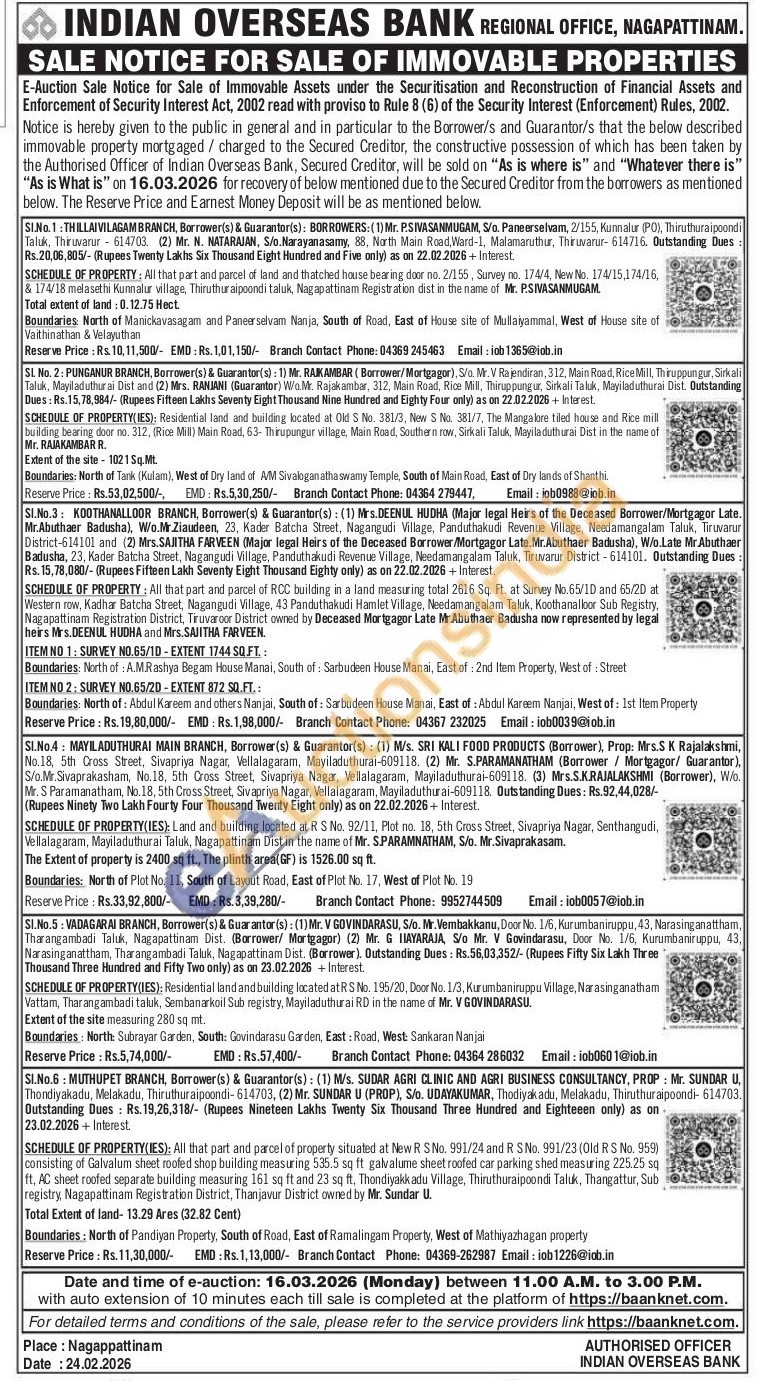 2) Residential land and building located at Old S No. 381/3, New S No. 381/7, The Mangalore tiled house and Rice mill building bearing door no. 312, (Rice Mill) Main Road, 63- Thirupungur village, Main Road, Southern row, Sirkali Taluk, Mayiladuthurai Dist in the name of Mr. RAJAKAMBAR R. Extent of the site - 1021 Sq.Mt. Boundaries: North of Tank (Kulam), West of Dry land of AM Sivaloganathaswamy Temple, South of Main Road, East of Dry lands of Shanthi