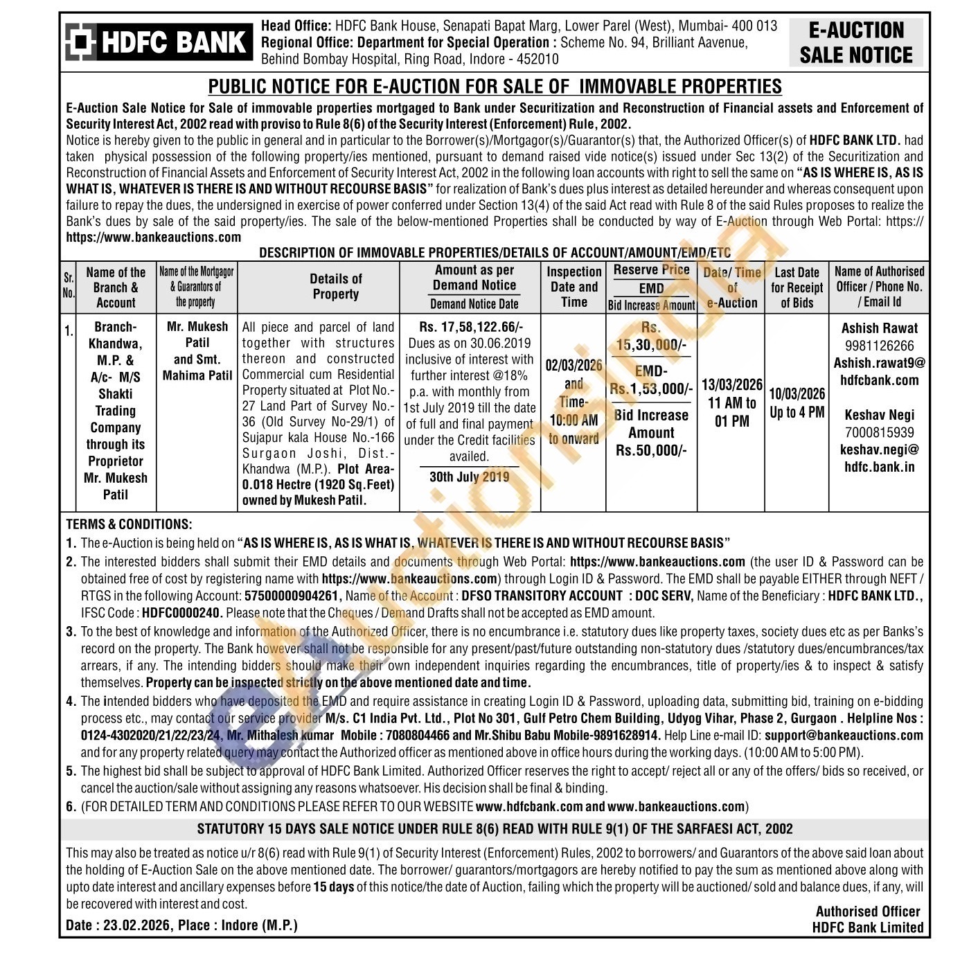 All piece and parcel of land together with structures thereon and constructed Commercial cum Residential Property situated at Plot No.-27 Land Part of Survey No.-36 (Old Survey No-29/1) of Sujapur kala House No.-166 Surgaon Joshi, Dist.-Khandwa (M.P.). Plot Area-0.018 Hectre (1920 Sq. Feet) owned by Mukesh Patil