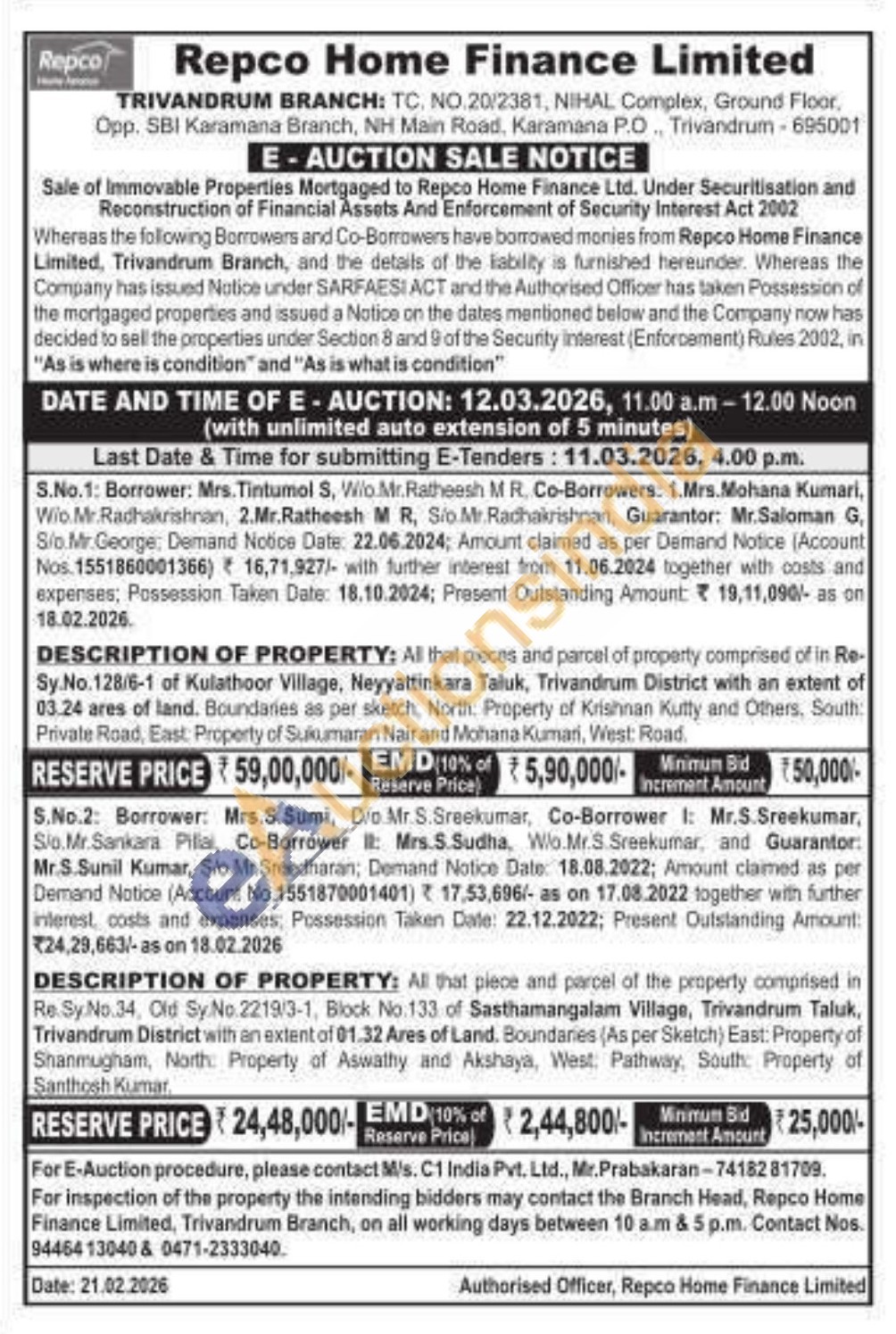 2) All that piece and parcel of the property comprised in Re Sy No.34, Old Sy. No.2219/3-1, Block No. 133 of Sasthamangalam Village, Trivandrum Taluk, Trivandrum District with an extent of 01.32 Ares of Land. Boundaries (As per Sketch) East: Property of Shanmugham, North: Property of Aswathy and Akshaya, West: Pathway, South: Property of Santhosh Kumar.