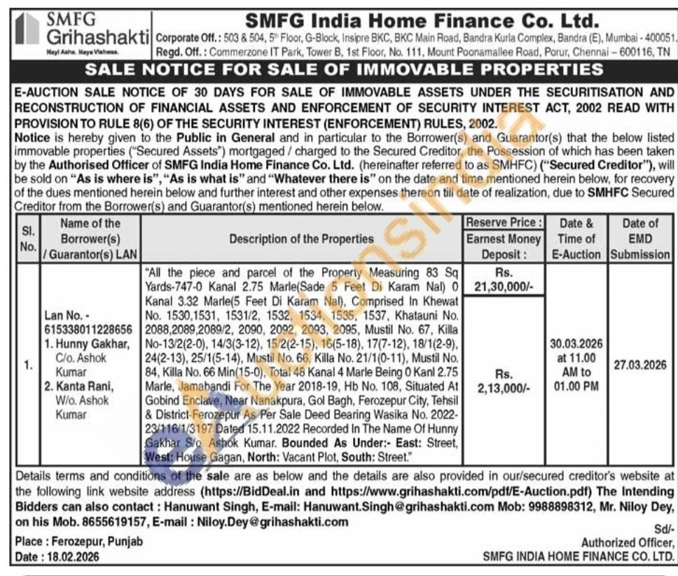 All the piece and parcel of the Property Measuring 83 Sq Yards-747-0 Kanal 2.75 Marle (Sade 5 Feet Di Karam Nal) 0 Kanal 3.32 Marle(5 Feet Di Karam Nal), Comprised In Khewat No. 1530,1531, 1531/2, 1532, 1534, 1535, 1537, Khatauni No. 2088,2089,2089/2, 2090, 2092, 2093, 2095, Mustil No. 67, Killa No-13/2(2-0), 14/3(3-12), 15/2(2-15), 16(5-18), 17(7-12), 18/1(2-9), 24(2-13), 25/1(5-14), Mustil No. 66, Killa No. 21/1(0-11), Mustil No. 84, Killa No. 66 Min(15-0), Total 48 Kanal 4 Marle Being 0 Kanl 2.75 Marle, Jamabandi For The Year 2018-19, Hb No. 108, Situated At Gobind Enclave, Near Nanakpura, Gol Bagh, irCity, Tehsil & District-Ferozepur As Per Sale Deed Bearing Wasika No. 2022-23/116/1/3197 Dated 15.11.2022 Recorded In The Name Of Hunny Gakhar S/o. Ashok Kumar. Bounded As Under:- East: Street, West: House Gagan, North: Vacant Plot, South: Street