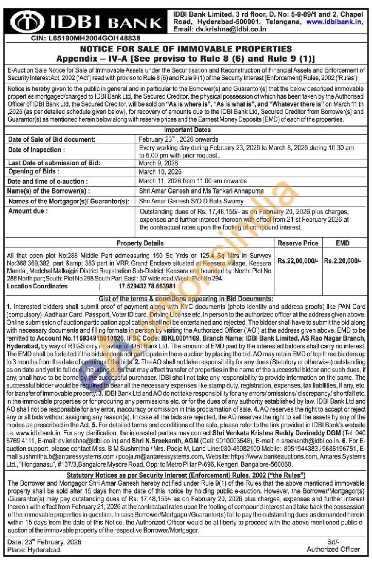 All that open plot No:288 Middle Part admeasuring 150 Sq Yrds or 125.4 Sq Mtrs in Survvey No:368 369,382, part & 383 part in VRR Grand Endave situated at Keesara Village, Keesara Mandal, Modchal Malkajgiri District Registration Sub-District: Keesare and bounded by :North: Plot No 288 North part; South: Plot No 288 South Part East: 30' wide road; West: Plot No 294. Location Coordinates