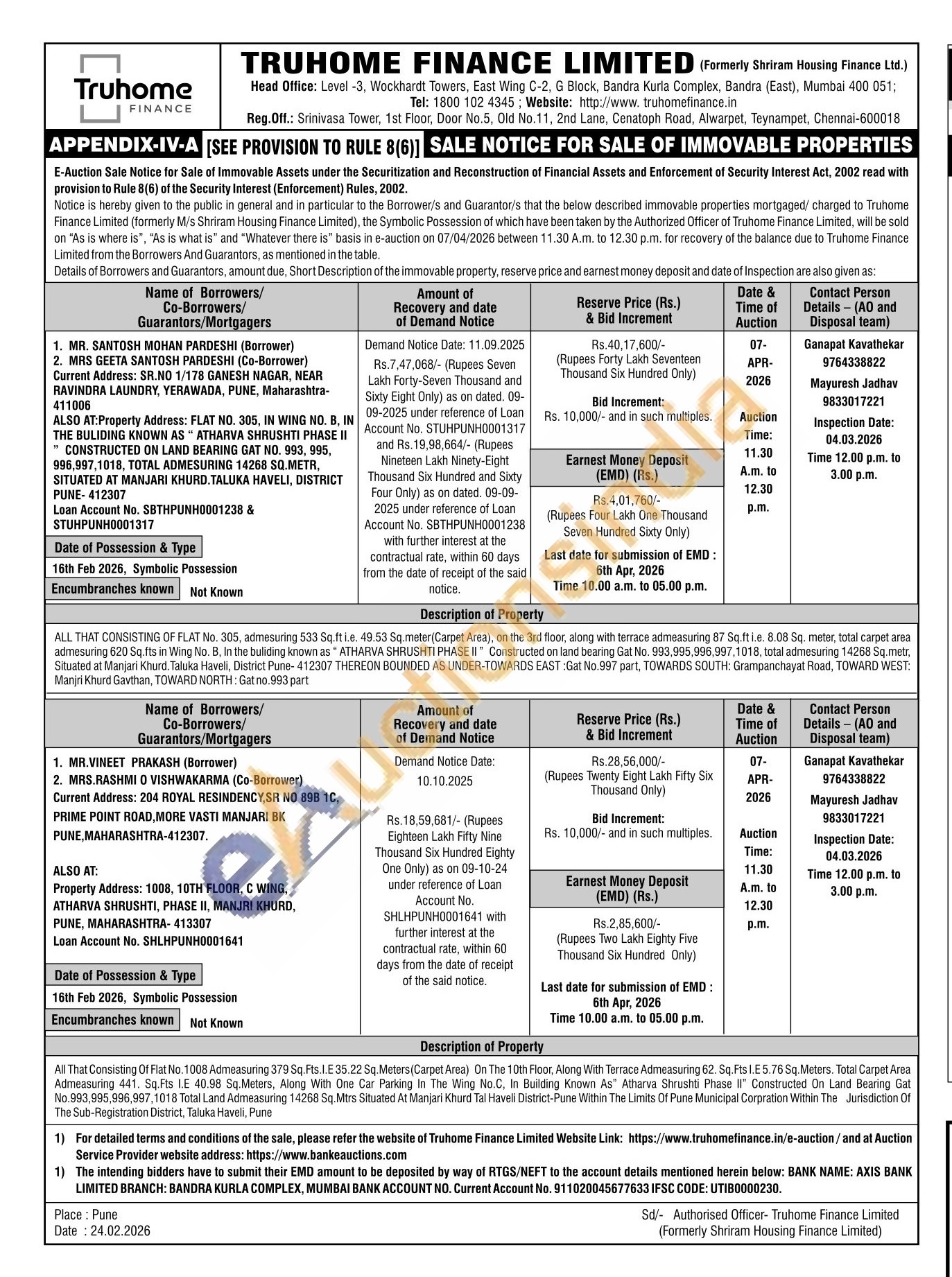 ALL THAT CONSISTING OF FLAT No. 305, admesuring 533 Sq.ft i.e. 49.53 Sq.meter(Carpet Area), on the 3rd floor, along with terrace admeasuring 87 Sq.fte. 8.08 Sq. meter, total carpet area admesuring 620 Sq.fts in Wing No. B, in the buliding known as ATHARVA SHRUSHTI PHASE II" Constructed on land bearing Gat No. 993,995,996.997,1018, total admesuring 14268 Sq.metr, Situated at Manjari Khurd. Taluka Haveli, District Pune-412307 THEREON BOUNDED AS UNDER TOWARDS EAST : Gat No.997 part, TOWARDS SOUTH: Grampanchayat Road, TOWARD WEST Manjri Khurd Gavthan, TOWARD NORTH: Gat no.993 part