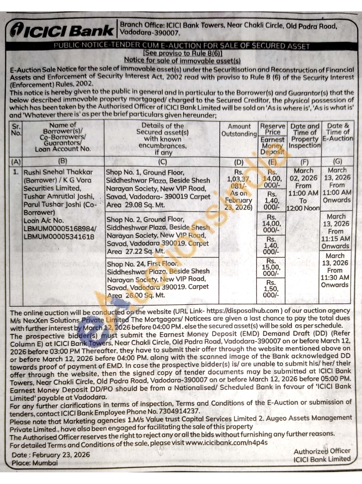 Shop No. 24, First Floor, Siddheshwar Plaza, Beside Shesh Narayan Society, New VIP Road, Savad, Vadodara 390019. Carpet Area 26.00 Sq. Mt.
