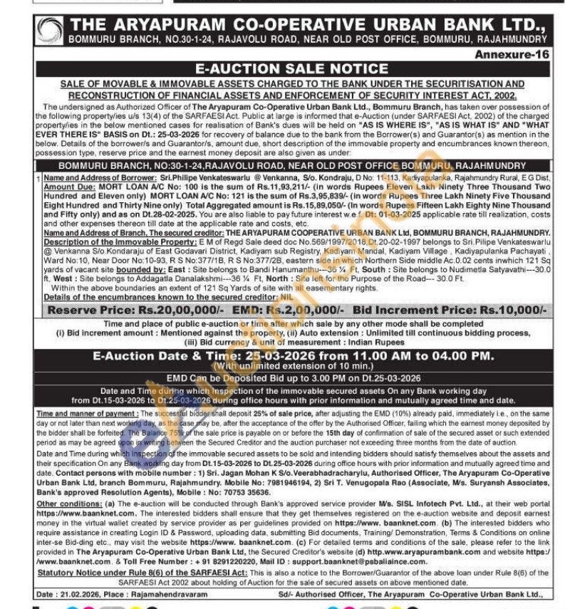 Description of the Immovable Property: EM of Regd Sale deed doc No.569/1997/2018. Dt. 20-02-1997 belongs to Sri. Pilipe Venkateswariu Venkanna Sio Kondaraju of East Godavari District, Kadiyam sub Registry, Kadiyam Mandal, Kadiyam Village Kadiyapulanka Pachayati, Ward No: 10, Near Door No:10-93, R S No:377/1B, R S No:377/2B, eastern side in which Northern Side middle Ac.0.02 cents inwhich 121 Sq yards of vacant site bounded by: East: Site belongs to Bandi Hanumanthu-36¼ Ft. South: Site belongs to Nudimetla Satyavathi--30.0 ft. West: Site belongs to Addagatla Danalakshmi-36% Ft, North: Site left for the Purpose of the Road 30.0 FL Within the above boundaries an extent of 121 Sq Yards of site with all easementary rights.