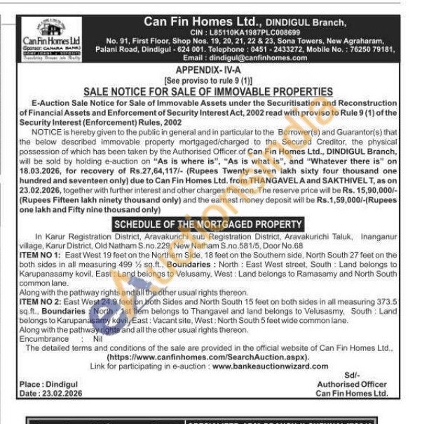 In Karur Registration District, Aravakurichi sub Registration District, Aravakurichi Taluk, Inanganur village, Karur District, Old Natham S.no.229, New Natham S.no.581/5, Door No.68 ITEM NO 1: East West 19 feet on the Northern Side, 18 feet on the Southem side, North South 27 feet on the both sides in all measuring 499% sq.ft., Boundaries: North East West street, South Land belongs to Karupanasamy kovil, East: Land belongs to Velusamy, West: Land belongs to Ramasamy and North South common lane. Along with the pathway rights and all the other usual rights thereon. ITEM NO 2: East West 24.9 feet on both Sides and North South 15 feet on both sides in all measuring 373.5 sq.ft., Boundaries: North: 1st item belongs to Thangavel and land belongs to Velusasmy, South: Land belongs to Karupanasamy kovil, East: Vacant site, West: North South 5 feet wide common lane. Along with the pathway rights and all the other usual rights thereon.