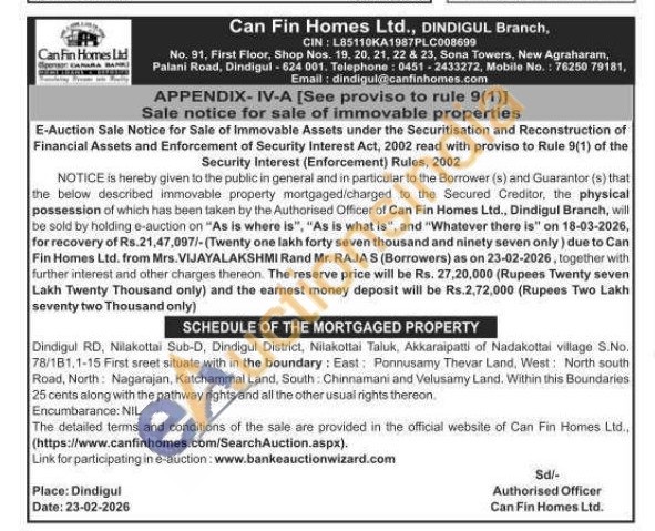 Dindigul RD, Nilakottai Sub-D, Dindigul District, Nilakottai Taluk, Akkaraipatti of Nadakottai village S.No. 78/181.1-15 First sreet situate with in the boundary: East: Ponnusamy Thevar Land, West: North south Road, North: Nagarajan, Katchammal Land, South Chinnamani and Velusamy Land. Within this Boundaries 25 cents along with the pathway rights and all the other usual rights thereon.
