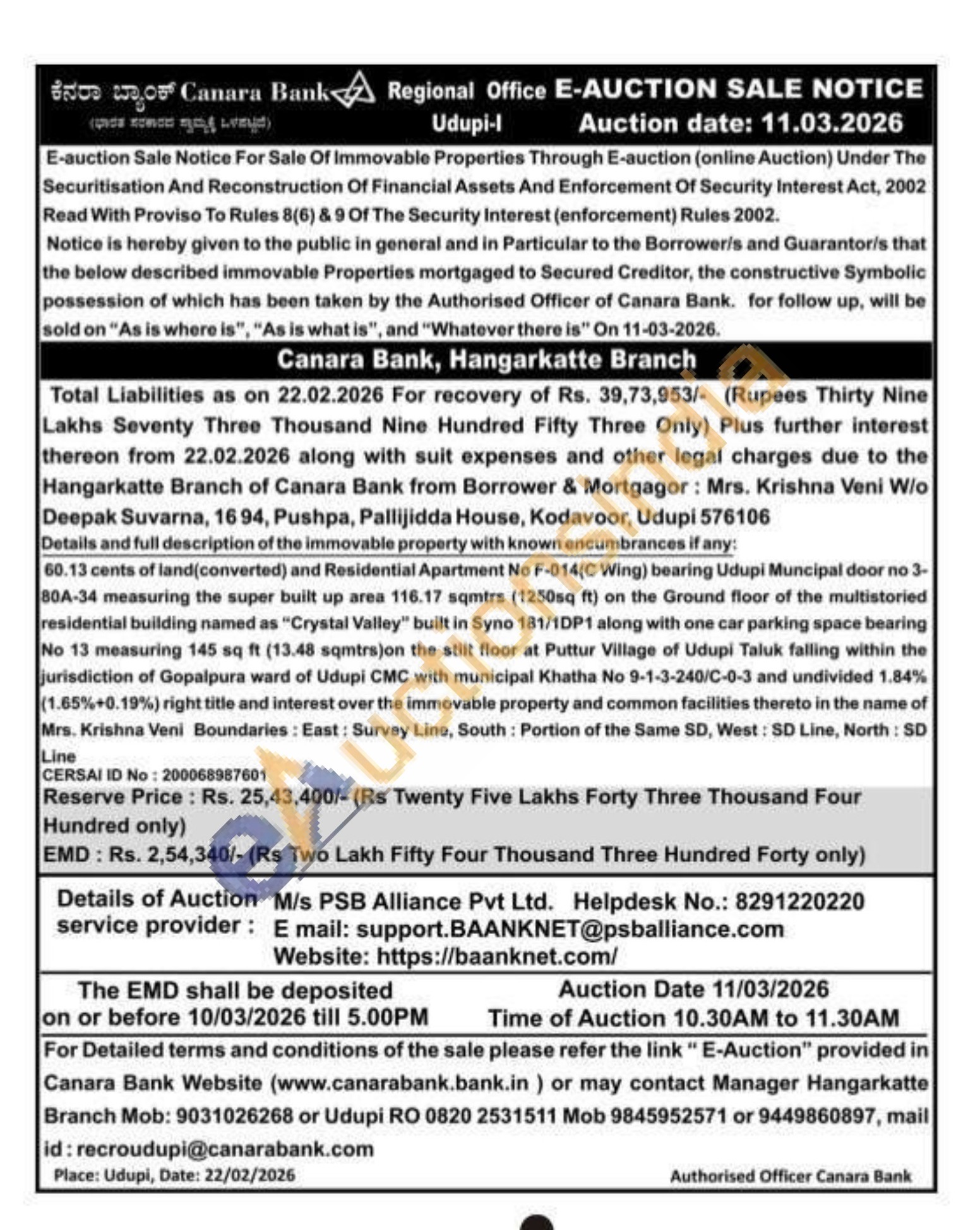 60.13 cents of land(converted) and Residential Apartment No F-014(C Wing) bearing Udupi Muncipal door no 3-80A-34 measuring the super built up area 116.17 sqmtrs (1250sq ft) on the Ground floor of the multistoried residential building named as "Crystal Valley" built in Syno 181/1DP1 along with one car parking space bearing No 13 measuring 145 sq ft (13.48 sqmtrs)on the stilt floor at Puttur Village of Udupi Taluk falling within the jurisdiction of Gopalpura ward of Udupi CMC with municipal Khatha No 9-1-3-240/C-0-3 and undivided 1.84% (1.65%+0.19%) right title and interest over the immovable property and common facilities thereto in the name of Mrs. Krishna Veni Boundaries: East: Survey Line, South: Portion of the Same SD, West: SD Line, North: SD Line
