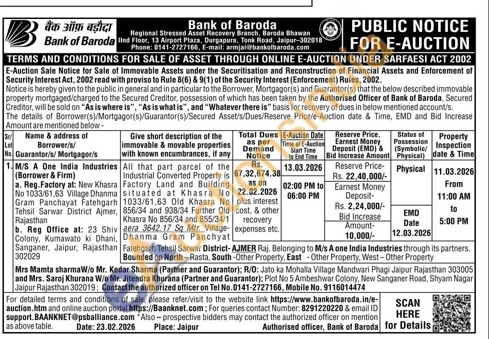 All that part parcel of the Industrial Converted Property is Factory Land and Building situated at Khasra No 1033/61,63 Old Khasra No 856/34 and 938/34 Further Old Khasra No 856/34 and 855/34/1 aera 3642.17 Sq Mtr. Village-Dhanma Gram Panchyat Fatehgarh Tehsil Sarwar District- AJMER Raj. Belonging to M/s A one India Industries through its partners. Bounded on North-Rasta, South-Other Property, East - Other Property, West-Other Property