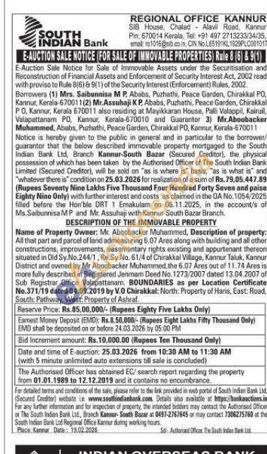 Name of Property Owner: Mr. Aboobacker Muhammed, Description of property: All that part and parcel of land admeasuring 6.07 Ares along with building and all other constructions, improvements, easementary rights existing and appurtenant thereon situated in Old Sy.No.244/1, Re.Sy.No. 61/4 of Chirakkal Village, Kannur Taluk, Kannur District and owned by Mr Aboobacker Muhammed.the 6.07 Ares out of 11.74 Ares is more fully described in Registered Jenmam Deed No. 1273/2007 dated 13.04.2007 of Sub Registrar Office Valapattanam. BOUNDARIES as per Location Certificate No.371/19 dated 04.09.2019 by V.0 Chirakkal: North: Property of Haris, East: Road, South: Pathway, West: Property of Ashraf
