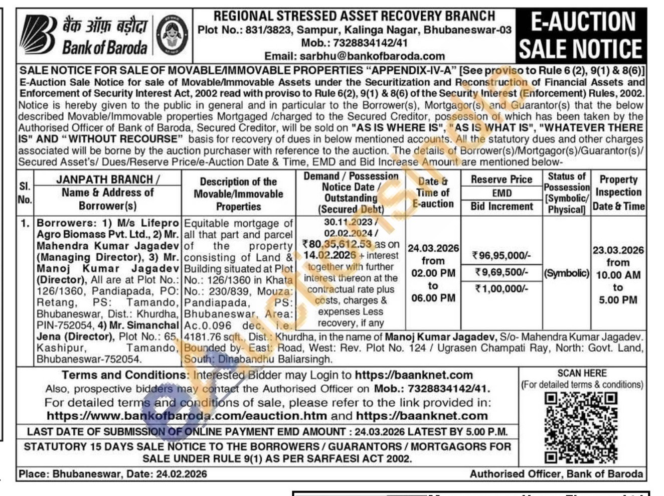 Equitable mortgage of all that part and parcel of the property consisting of Land & Building situated at Plot No.: 126/1360 in Khata No.: 230/839, Mouza: Pandiapada PS Bhubaneswar, Area A c.0.096 dec i.e 4181.76 sqft., Dist.: Khurdha, in the name of Manoj Kumar Jagadev, S/o- Mahendra Kumar Jagadev. , Bounded by- East: Road, West: Rev. Plot No. 124/ Ugrasen Champati Ray, North: Govt. Land, South: Dinabandhu Baliarsingh