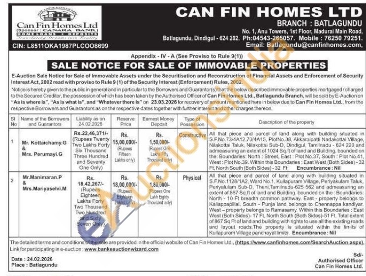 All that piece and parcel of land along with building situated in S.F.No. 73/4A12,73/4A15, Plot No 38, Akkaraipatti Nadakottai Village, Nilakottai Taluk, Nilakottai Sub-D, Dindigul, Tamilnadu-624 220 and admeasuring an extent of 1024 Sq. ft of land and Building, bounded on the: Boundaries: North: Street, East: Plot No.37, South Plot No 41, West: Plot No.39. Within this Boundaries: East West (Both Sides)-32 Ft. North South (Both Sides)-32 Ft. Encumbrance: Nil