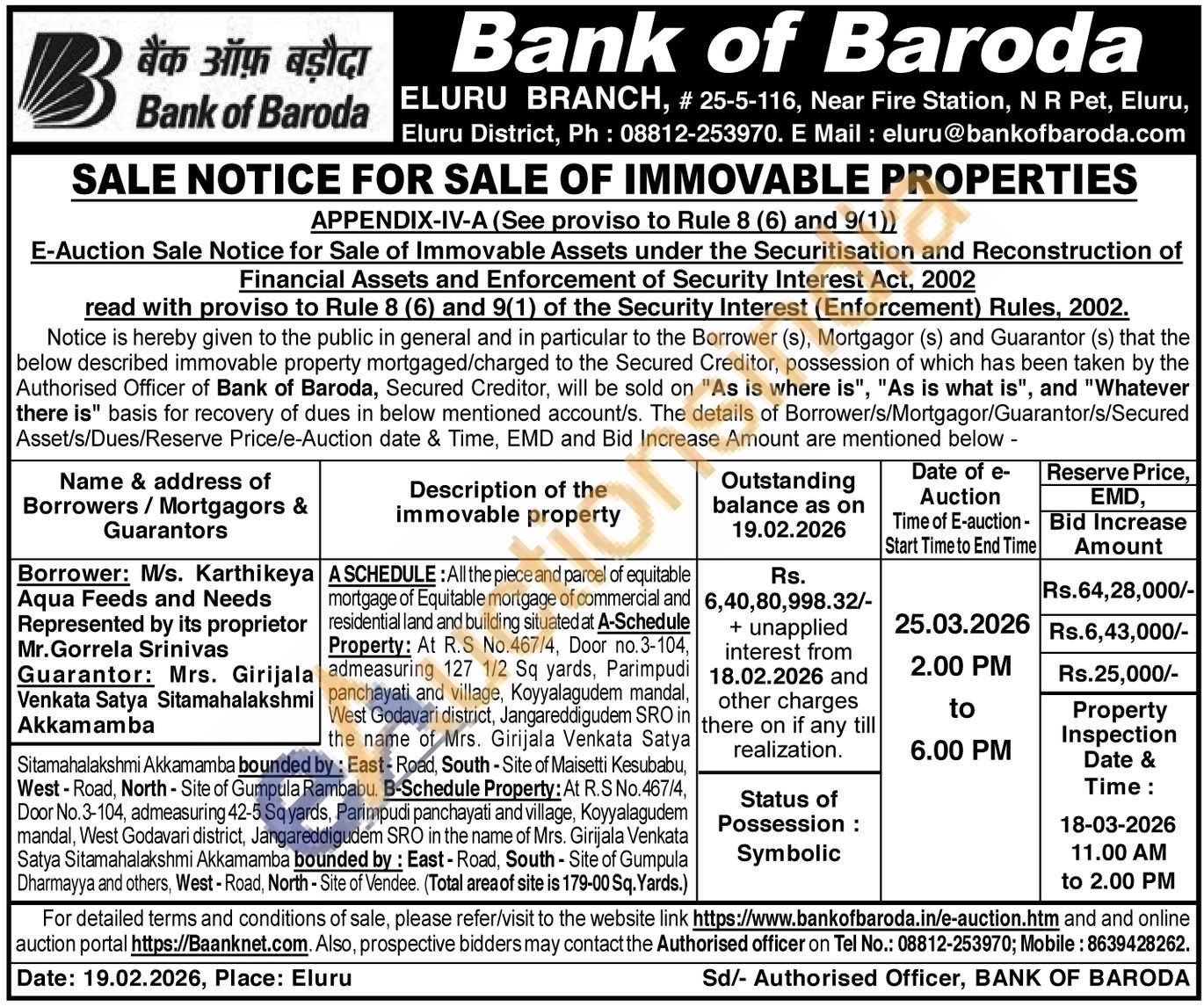 A SCHEDULE: All the piece and parcel of equitable mortgage of Equitable mortgage of commercial and residential land and building situated at A-Schedule Property: At R.S No.467/4, Door no.3-104, admeasuring 127 1/2 Sq yards, Parimpudi panchayati and village, Koyyalagudem mandal, West Godavari district, Jangareddigudem SRO in the name of Mrs. Girijala Venkata Satya Sitamahalakshmi Akkamamba bounded by: East-Road, South - Site of Maisetti Kesubabu, West-Road, North - Site of Gumpula Rambabu. B-Schedule Property: At R.S No. 467/4, Door No.3-104, admeasuring 42-5 Sq yards, Parimpudi panchayati and village, Koyyalagudem mandal, West Godavari district, Jangareddigudem SRO in the name of Mrs. Girijala Venkata Satya Sitamahalakshmi Akkamamba bounded by: East-Road, South - Site of Gumpula Dharmayya and others, West-Road, North - Site of Vendee. (Total area of site is 179-00 Sq. Yards