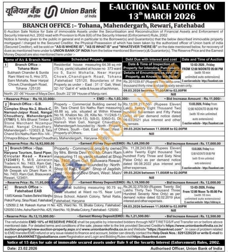 Property - Commercial property owned , by Mrs. Bimla Devi W/o Mr. Dhani Ram measuring 11 sq yards situated at Shop No. 7408, Ram Gali, Balluwara Rewari, Teh. & Distt. Rewari bounded by: North: Shop of Raju, South: Shop of Jagdish, East: House of Devi Shani, West: Main/Gur Bazar.