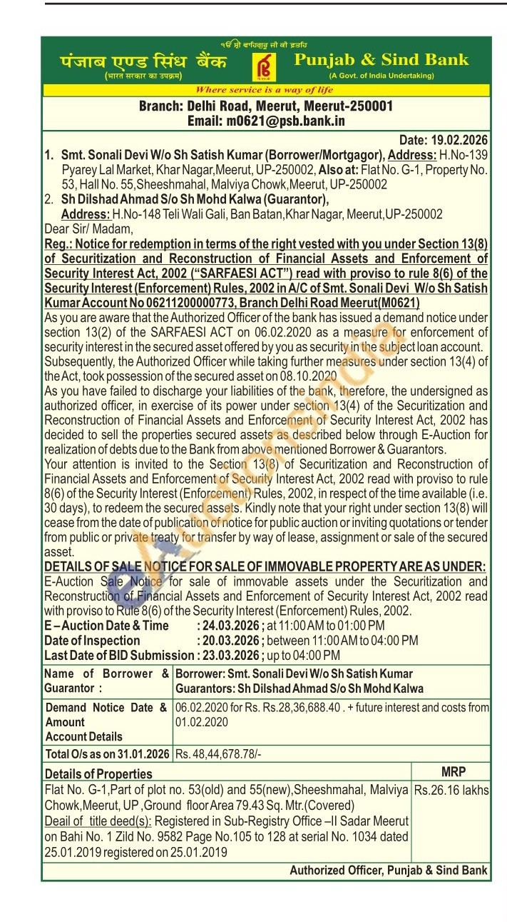 Flat No. G-1,Part of plot no. 53(old) and 55(new), Sheeshmahal, Malviya Chowk, Meerut, UP, Ground floor Area 79.43 Sq. Mtr. (Covered) Deail of title deed(s): Registered in Sub-Registry Office -II Sadar Meerut on Bahi No. 1 Zild No. 9582 Page No. 105 to 128 at serial No. 1034 dated 25.01.2019 registered on 25.01.2019