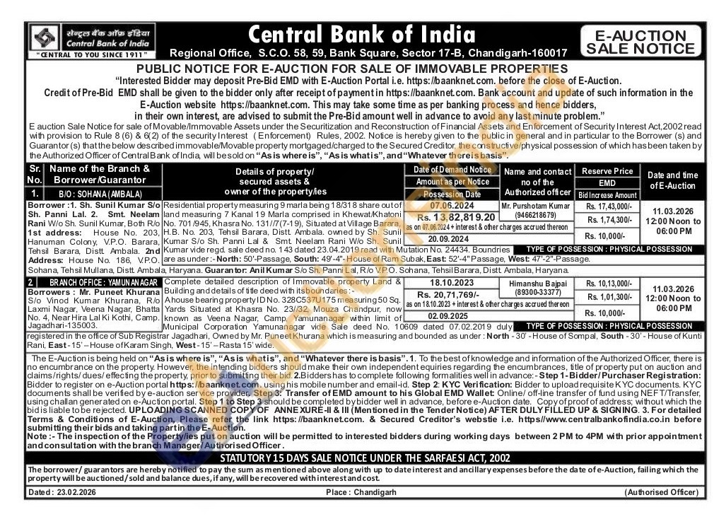 Residential property measuring 9 marla being 18/31 8 share out of land measuring 7 Kanal 19 Marla comprised in Khewat/Khatoni No. 701/945, Khasra No. 131//7(7-19), Situated at Village Barara H.B. No. 203, Tehsil Barara, Distt. Ambala, owned by Sh. Sunil Kumar S/o Sh. Panni Lal & Smt. Neelam Rani W/o Sh. Sunil Kumar vide regd. sale deed no. 143 dated 23.04.2019 read with Mutation No. 24434. Boundries are as under:-North: 50'-Passage, South: 49-4"-House of Ram Subak, East: 52'-4" Passage, West: 47-2"-Passage