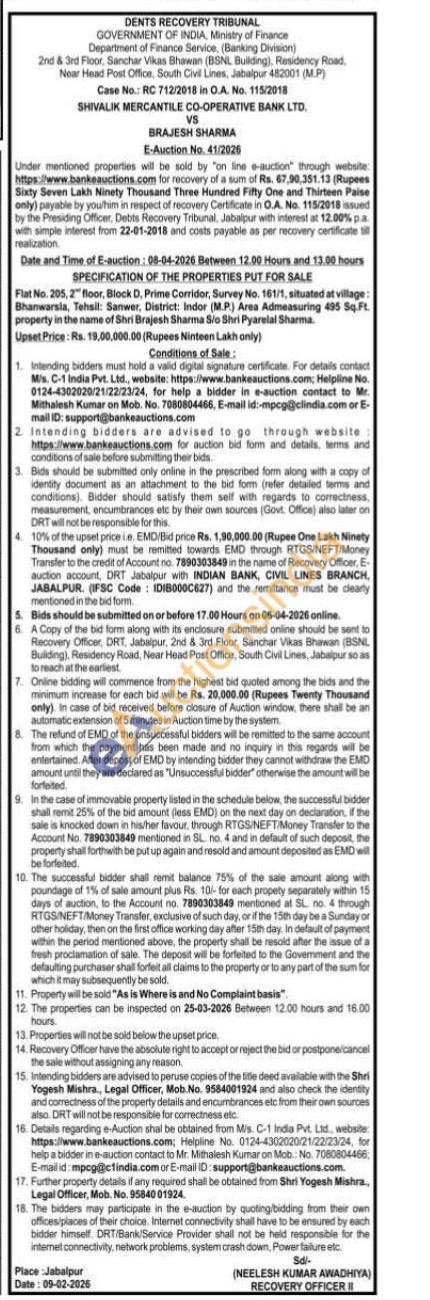 Flat No. 205, 2 floor, Block D, Prime Corridor, Survey No. 161/1, situated at village: Bhanwarsla, Tehsil: Sanwer, District: Indor (MP) Area Admeasuring 495 Sq.Ft. property in the name of Shri Brajesh Sharma Sio Shri Pyarelal Sharma.
