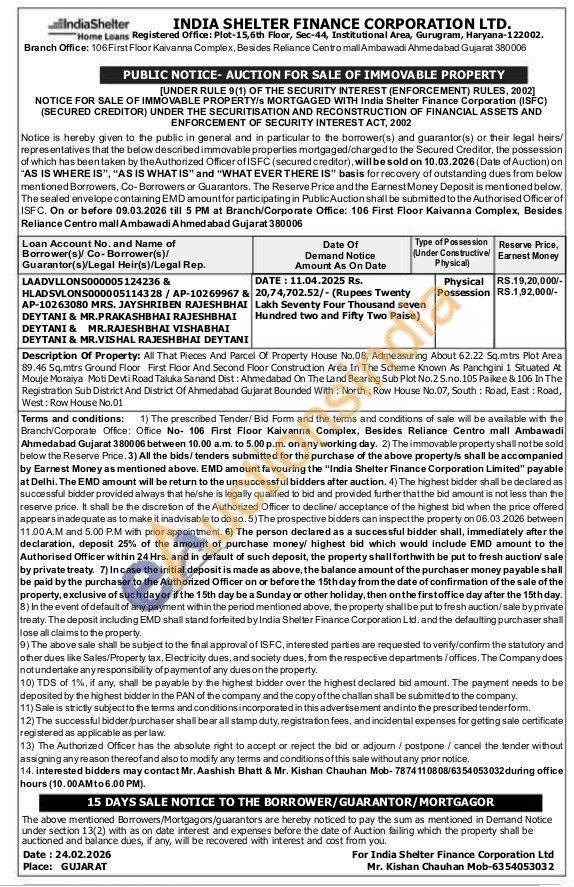 Description Of Property: All That Pieces And Parcel Of Property House No.08, Admeasuring About 62.22 Sq.mtrs Plot Area 89.46 Sq.mtrs Ground Floor First Floor And Second Floor Construction Area In The Scheme Known As Panchgini 1 Situated At Mouje Moraiya Moti Devti Road Taluka Sanand Dist: Ahmedabad On The Land Bearing Sub Plot No.2 S.no. 105 Paikee & 106 In The Registration Sub District And District Of Ahmedabad Gujarat Bounded With: North: Row House No.07, South: Road, East: Road, West: Row House No.01