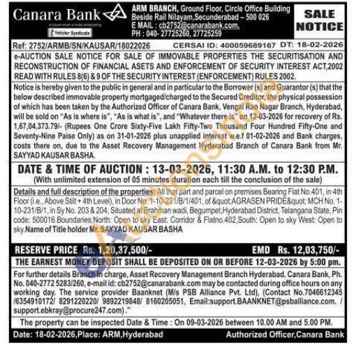 Details and full description of the properties: All that part and parcel on premises Bearing Flat No.401, in 4th Floor (i.e., Above Stilt+4th Level), in Door No. 1-10-231/8/1/401, of ": AGRASEN PRIDE" MCH No. 1-10-231/B/1, in Sy No. 203 & 204, Situated at Brahman wadi, Begumpet, Hyderabad District, Telangana State, Pin code: 500016.Boundaries: North: Open to sky East: Comdor & Flatno.402, South: Open to sky West: Open to sky. Name of Title holder Mr. SAYYAD KAUSAR BASHA