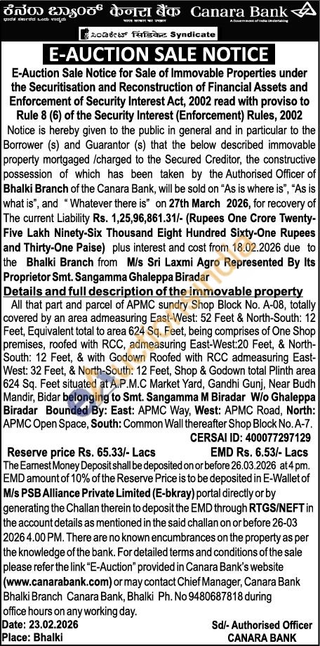 All that part and parcel of APMC sundry Shop Block No. A-08, totally covered by an area admeasuring East-West: 52 Feet & North-South: 12 Feet, Equivalent total to area 624 Sq. Feet, being comprises of One Shop premises, roofed with RCC, admeasuring East-West:20 Feet, & North-South: 12 Feet, & with Godown Roofed with RCC admeasuring East-West: 32 Feet, & North-South: 12 Feet, Shop & Godown total Plinth area 624 Sq. Feet situated at A.P.M.C Market Yard, Gandhi Gunj, Near Budh Mandir, Bidar belonging to Smt. Sangamma M Biradar W/o Ghaleppa Biradar Bounded By: East: APMC Way, West: APMC Road, North: APMC Open Space, South: Common Wall thereafter Shop Block No. A-7.