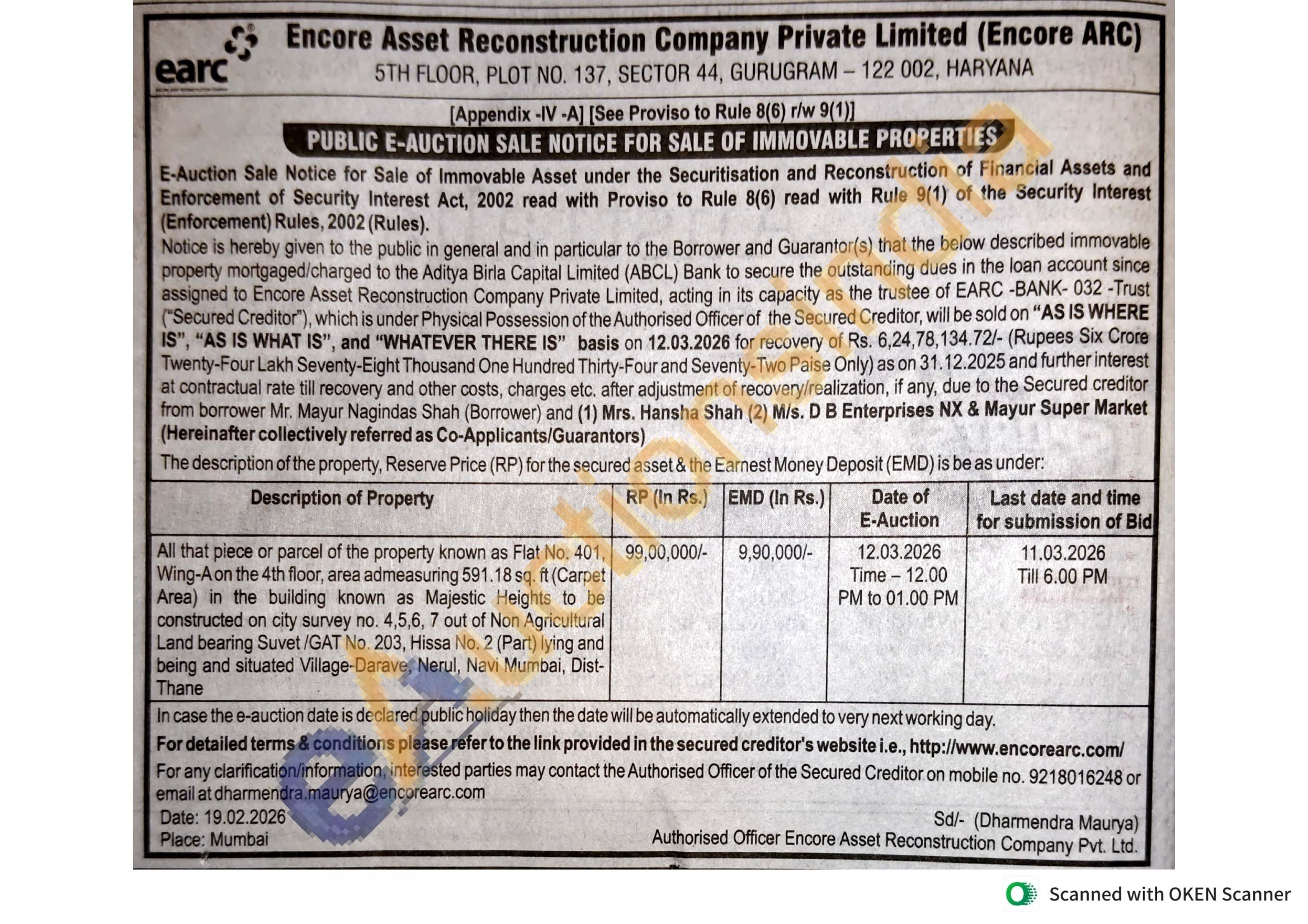 Contact Authorised Officer of the Secured Creditor on mobile no. 9218016248