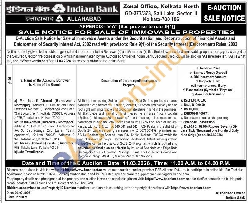 All that piece and parcel of land measuring an area 4 (four) cottahs 15(fifteen) chittacks 42(forty-two) sq.ft. be the same, a little more or less comprised in dag no. 294 under khatian nos. 1276 and 1277 at mouza-kasba, J.L no.13, touzi no. 340,341 and 342, P.S- Kasba in the district of South 24 parganas being assessee no. 210670504499, premises no. 5A/13, Bediadanga Second Lane, P.S- Kasba, Kolkata -700039 within the limit of Kolkata Municipal Corporation, Additional District sub-registration office-Sealdah in the district of South 24-Parganas, which is butted and bounded as details aside: North: By house of Sita Nath and Priya Nath Sardar, South: By Common Passage, East: By House of Sudama and Ram Grahi Singh, West: By Mandir (Partof Dag No.292)