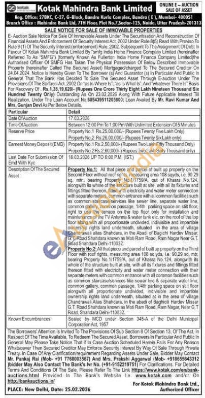 Property No.1: All that piece and parcel of built up property on the Second Floor without roof rights, measuring area 108 sqyds, i.e. 90.29 sq. mtr, beaning Property No.1/1759/A, out of Khasra No.124, alongwith its whole of the structure built at site, with all its fixtures and fittings fitted thenson, fitted with electricity and waller meter connection with separate meters, common entrance with all common facilities such as common staircase/services like sewer line, separate water line. common gallery, common passage, 1.4th parking space on stilt floor, right to use the terrace on the top floor only for installation and maintenance of the TV Antenna & water tank etc. on the roof of the top floor along with all proportionate undivided, indivisible and impartible ownership rights land underneath, situated in the area of village Chandrawali alias Shahdara, in the Abadi of Bagichi Hardev Missar G.T. Road Shahdara known as Moti Ram Road, Ram Nagar Near G.T. Road Shahdara Delhi-110032