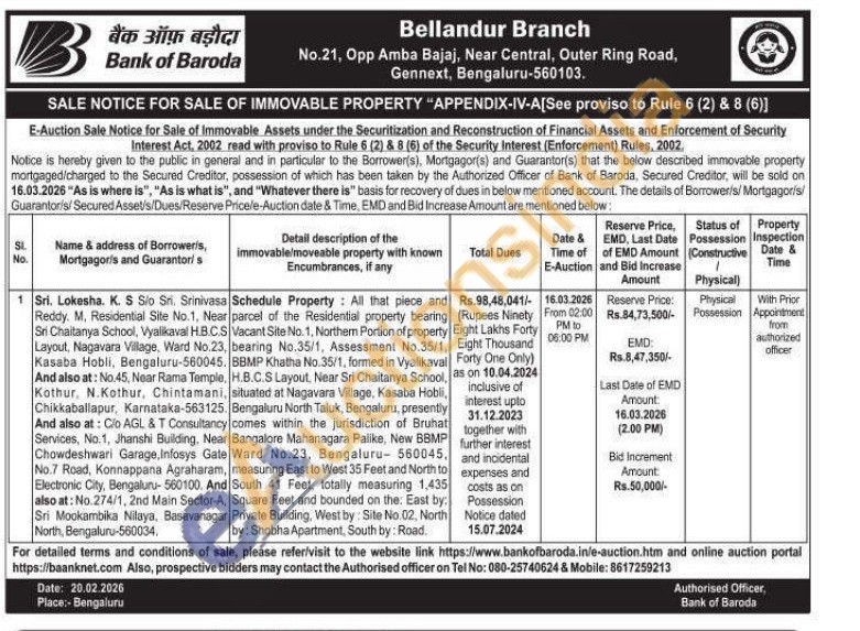 Schedule Property All that piece and parcel of the Residential property bearing Vacant Site No. 1, Northem Portion of property bearing No.35/1, Assessment No.35/1, BBMP Khatha No.35/1, formed in Vyalikaval H.B.C.S Layout, Near Sri Chaitanya School, situated at Nagavara Village, Kasaba Hobli, Bengaluru North Taluk, Bengaluru, presently comes within the jurisdiction of Bruhat Bangalore Mahanagara Palike, New BBMP Ward No.23, Bengaluru 560045, measuring East to West 35 Feet and North to South 41 Feet, totally measuring 1,435 Square Feet and bounded on the: East by: Private Building, West by: Site No.02, North by: Shobha Apartment, South by: Road.