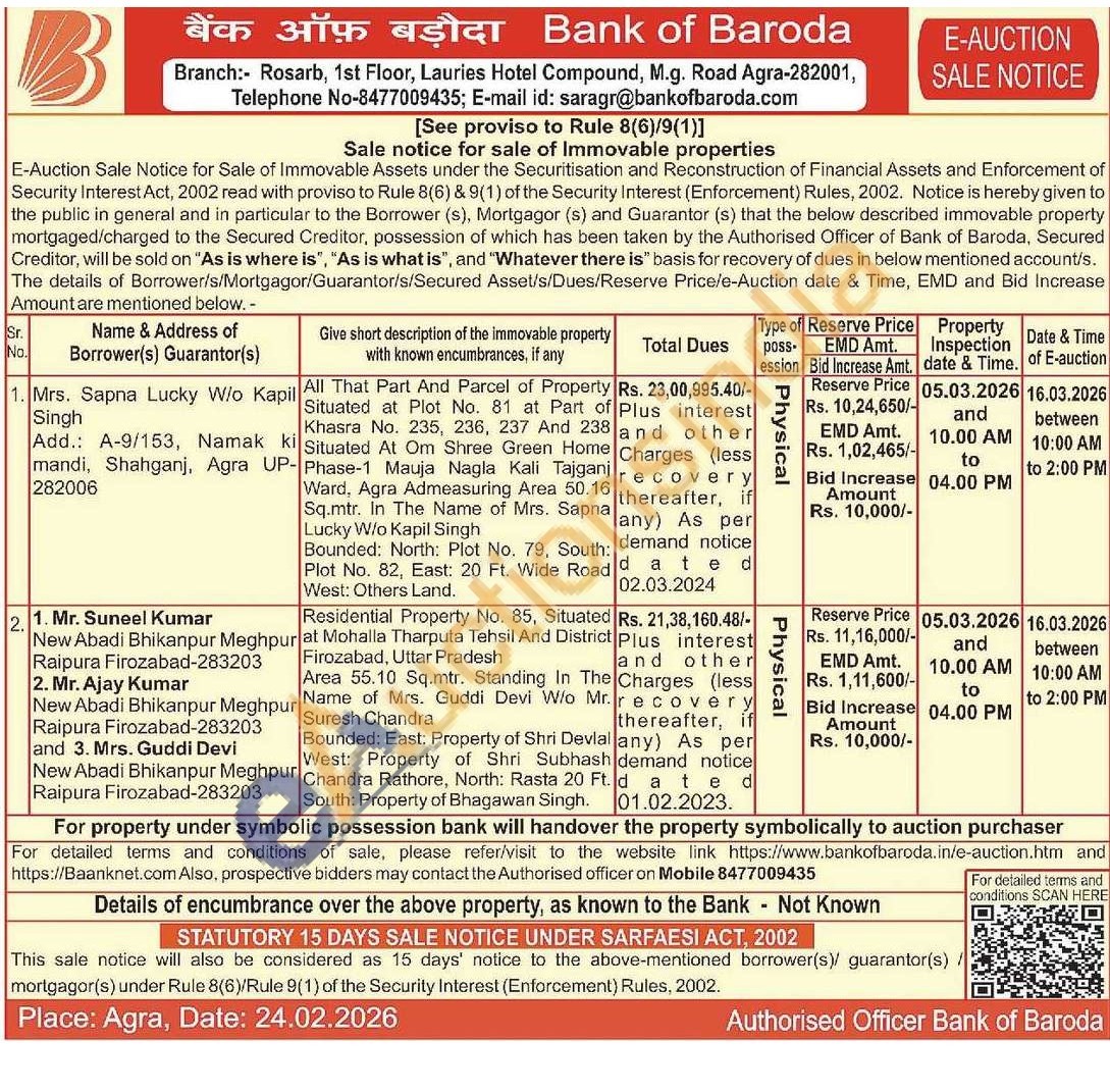 Residential Property No. 85, Situated at Mohalla Tharputa Tehsil And District Firozabad, Uttar Pradesh Area 55.10 Sq.mtr. Standing In The Name of Mrs. Guddi Devi W/o Suresh Chandra Bounded: East: Property of Shri Devlal West: Property of Shri Subhash Chandra Rathore, North: Rasta 20 South: Property of Bhagawan Singh