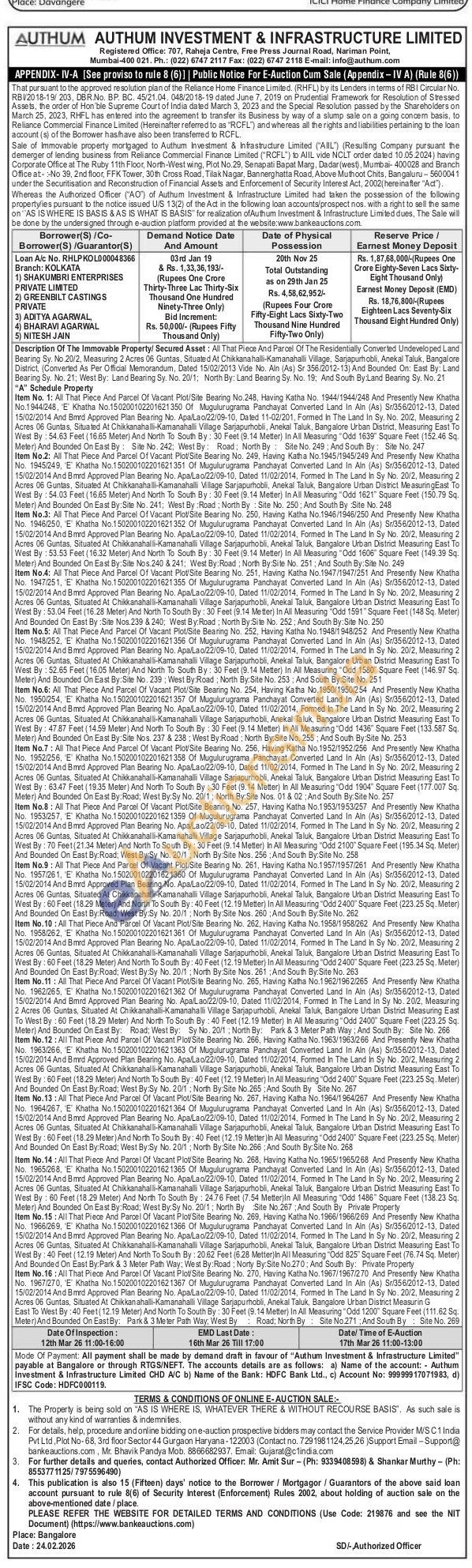 Description Of The Immovable Property/Secured Asset: All That Piece And Parcel Of The Residentially Converted Undeveloped Land Bearing Sy. No 20/2, Measuring 2 Acres 06 Guntas, Situated At Chikkanahalli-Kamanahalli Village, Sarjapurh obli, Anekal Taluk, Bangalore District, (Converted As Per Official Memorandum, Dated 15/02/2013 Vide No. Aln (As) Sr 356/2012-13) And Bounded On: East By: Land Bearing Sy. No. 21; West By: Land Bearing Sy. No. 20/1: North By: Land Bearing Sy. No. 19; And South By:Land Bearing Sy. No. 21 "A" Schedule Property Item No. 1: All That Piece And Parcel Of Vacant Plot/Site Bearing No.248, Having Katha No. 1944/1944/248 And Presently New Khatha No.1944/248, E Khatha No.150200102201621350 Of Mugulurugrama Panchayat Converted Land In Aln (As) Sr/356/2012-13, Dated 15/02/2014 And Bmrd Approved Plan Bearing No. Apa/Lao/22/09-10. Dated 11-02/201, Formed In The Land In Sy. No. 20/2, Measuring 2 Acres 06 Guntas, Situated At Chikkanahalli-Kamanahalli Village Sarjapurhobli, Anekal Taluk, Bangalore Urban District, Measuring East To West By: 54.63 Feet (16.65 Meter) And North To South By: 30 Feet (9.14 Metter) In All Measuring "Odd 1639" Square Feet (152.46 Sq. Meter) And Bounded On East By: Site No. 242; West By: Road North By Site No. 249; And South By: Site No. 247 Item No.2: All That Piece And Parcel Of Vacant Plot/Site Bearing No. 249, Having Katha No. 1945/1945/249 And Presently New Khatha No. 1945/249, E Khatha No.150200102201621351 Of Mugulurugrama Panchayat Converted Land In Ain (As) Sr/356/2012-13, Dated 15/02/2014 And Bmrd Approved Plan Bearing No. Apa/Lao/22/09-10, Dated 11/02/2014, Formed In The Land In Sy No. 20/2, Measuring 2 Acres 06 Guntas, Situated At Chikkanahalli-Kamanahalli Village Sarjapurhobli, Anekal Taluk, Bangalore Urban District MeasuringEast To West By: 54.03 Feet (16.65 Meter) And North To South By: 30 Feet (9.14 Metter) In All Measuring "Odd 1621" Square Feet (150.79 Sq. Meter) And Bounded On East By:Site No. 241, West By: Road, North By: Site No. 250; And South By Site No. 248 Item No.3: All That Piece And Parcel Of Vacant Plot/Site Bearing No. 250, Having Katha No.1946/1946/250 And Presently New Khatha No. 1946/250, E Khatha No.150200102201621352 Of Mugulurugrama Panchayat Converted Land In Ain (As) Sr/356/2012-13, Dated 15/02/2014 And B mrd Approved Plan Bearing No. Apa/Lao/22/09-10, Dated 11/02/2014, Formed In The Land In Sy No. 20/2, Measuring 2 Acres 06 Guntas. Situated At Chikkanahalli-Kamanahalli Village Sarjapurhobli, Anekal Taluk, Bangalore Urban District Measuring East To West By: 53.53 Feet (16.32 Meter) And North To South By: 30 Feet (9.14 Metter) In All Measuring "Odd 1606" Square Feet (149.39 Sq. Meter) And Bounded On East By:Site Nos.240 & 241; West By: Road; North By:Site No. 251; And South By: Site No. 249 Item No.4: All That Piece And Parcel Of Vacant Plot/Site Bearing No. 251, Having Katha No.1947/1947/251 And Presently New Khatha No. 1947/251, E Khatha No.150200102201621355 Of Mugulurugrama Panchayat Converted Land In Ain (As) Sr/356/2012-13, Dated 15/02/2014 And B mrd Approved Plan Bearing No. Apa/Lao/22/09-10, Dated 11/02/2014, Formed in The Land in Sy No. 20/2, Measuring 2 Acres 06 Guntas, Situated At Chikkanahalli-Kamanahalli Village Sarjapurhobli, Anekal Taluk, Bangalore Urban District Measuring East To West By: 53.04 Feet (16.28 Meter) And North To South By: 30 Feet (9.14 Metter) In All Measuring "Odd 1591" Square Feet (148 Sq. Meter) And Bounded On East By: Site Nos.239 & 240; West By: Road: North By:Site No. 252; And South By: Site No. 250 Item No.5: All That Piece And Parcel Of Vacant Plot/Site Bearing No. 252, Having Katha No. 1948/1948/252 And Presently New Khatha No. 1948/252. E Khatha No.150200102201621356 Of Mugulurugrama Panchayat Converted Land In Aln (As) Sr/356/2012-13, Dated 15/02/2014 And Bmrd Approved Plan Bearing No. Apa/Lao/22/09-10, Dated 11/02/2014, Formed In The Land in Sy No. 20/2, Measuring 2 Acres 06 Guntas, Situated At Chikkanahalli-Kamanahalli Village Sarjapurhobli, Anekal Taluk, Bangalore Urban District Measuring East To West By: 52.65 Feet (16.05 Meter) And North To South By: 30 Feet (9.14 Metter) In All Measuring "Odd 1580" Square Feet (146.97 Sq. Meter) And Bounded On East By:Site No. 239 West By:Road: North By:Site No. 253; And South By:Site No. 251